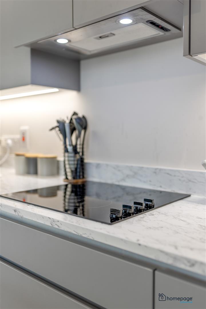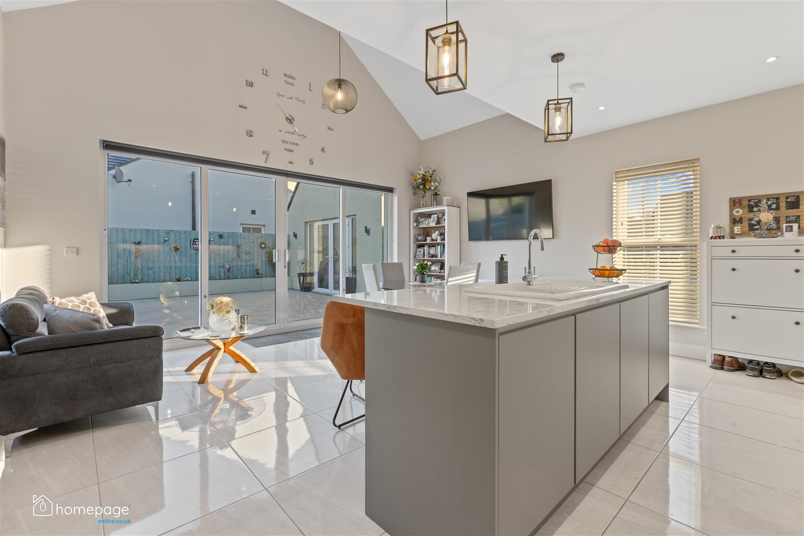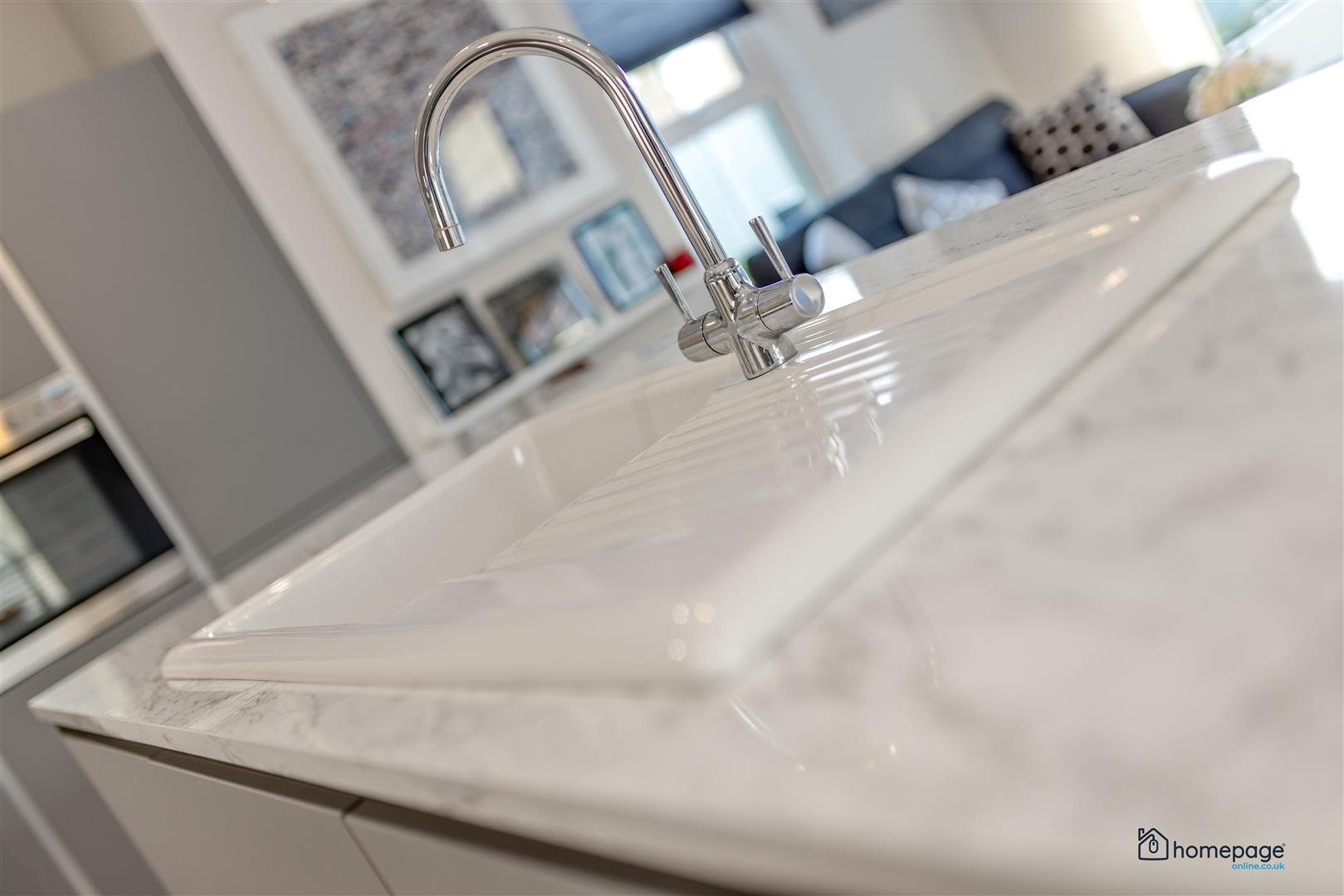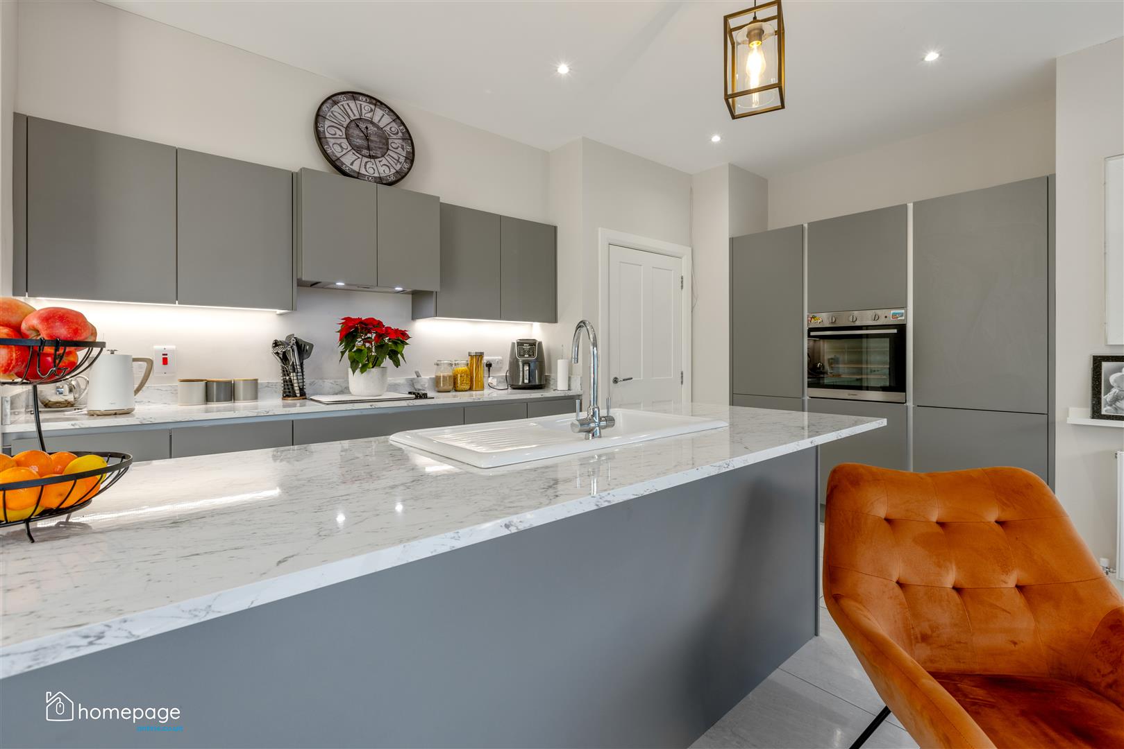 The large open plan kitchen / dining space is fitted with a wide range of high and low level storage, contemporary soft close doors, slimeline worktops with upstand, electric hob , high level oven, integrated dishwasher, centre island with seating and feature lighting, high quality tiling and spot lights throughout.