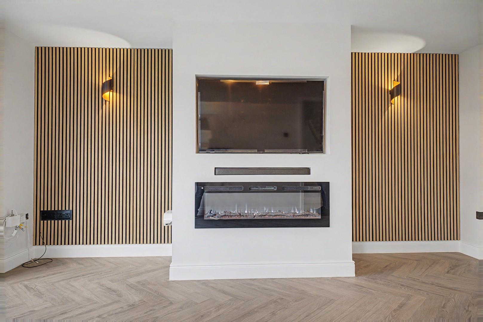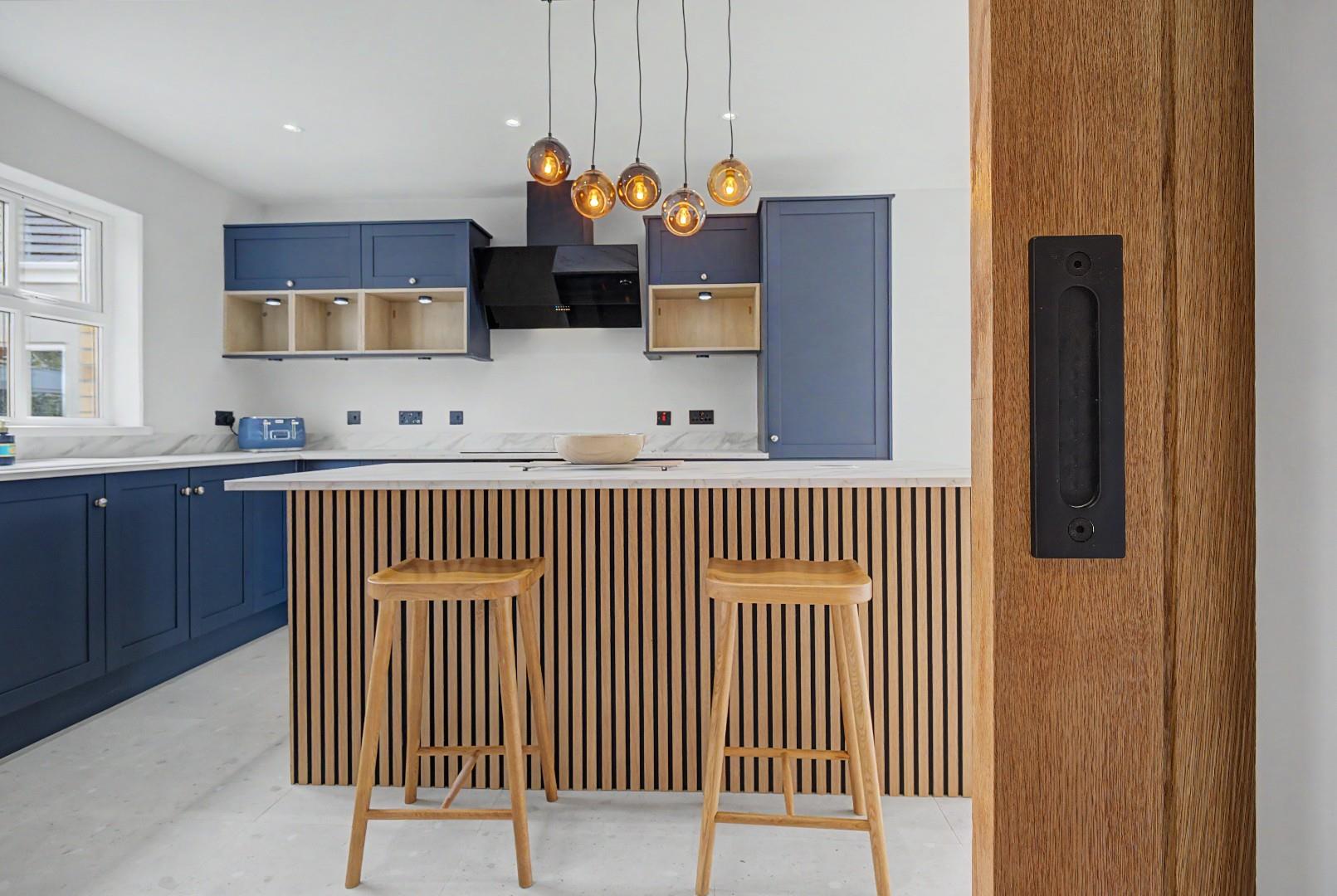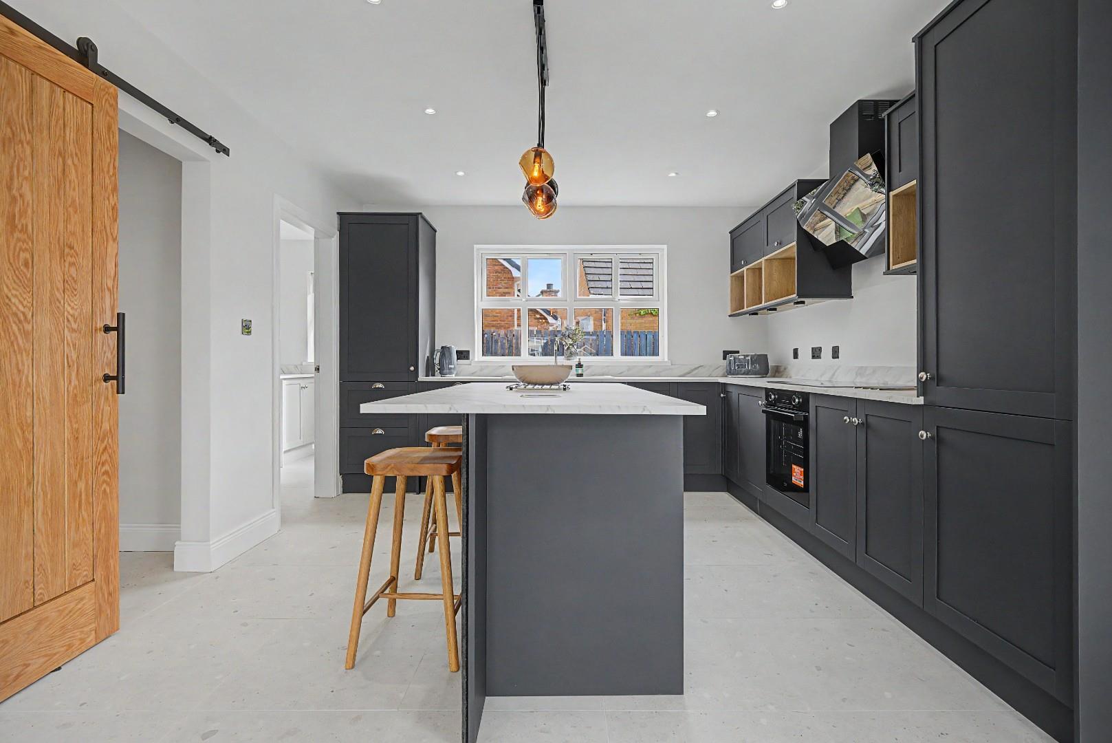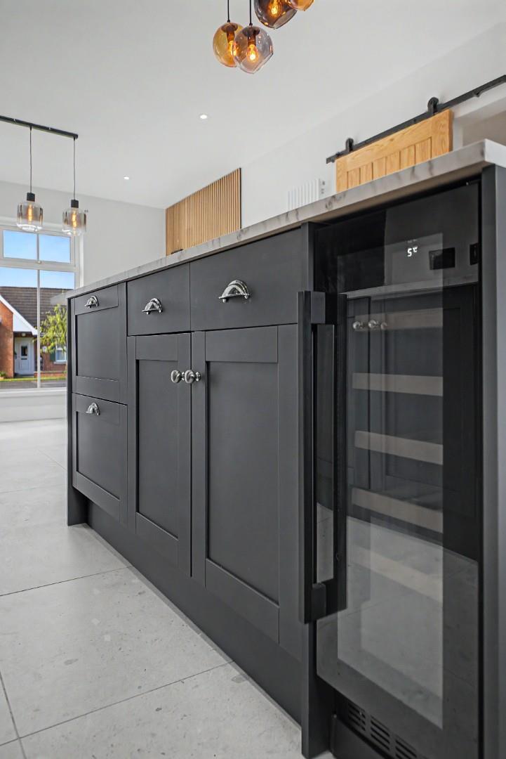 The ground floor comprises a welcoming entrance hall, spacious living room with feature media wall, and a contemporary kitchen / dining area fitted with a range of modern units. The layout provides comfortable and practical living space throughout.