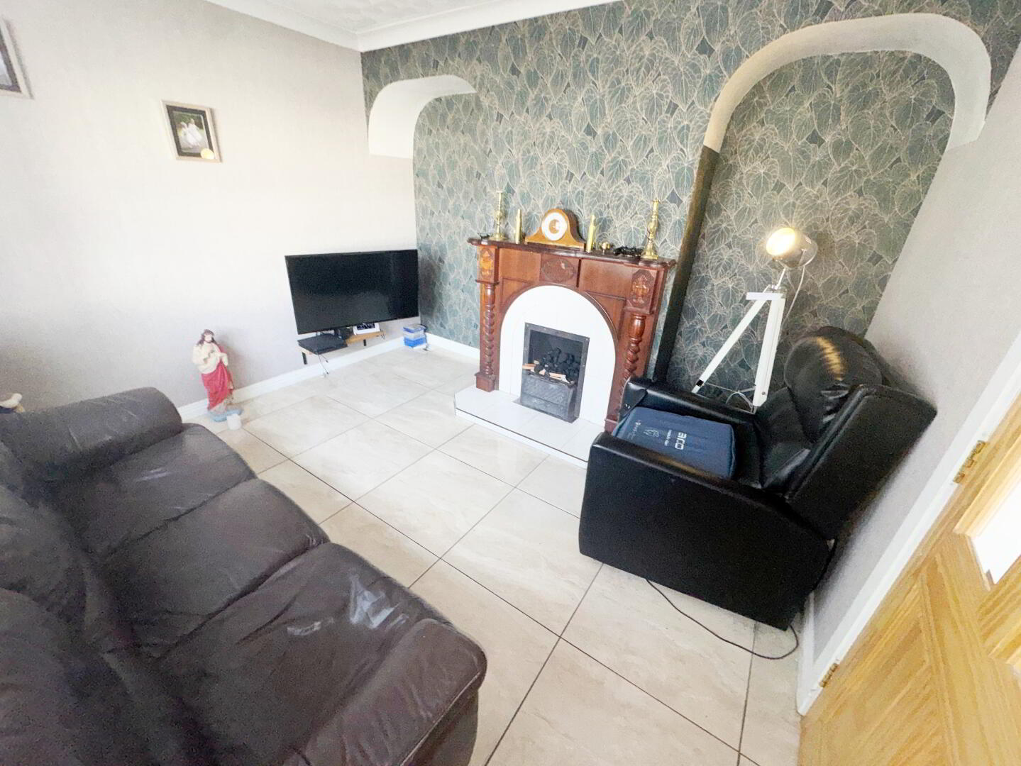 Open fire with mahogany surround. Tiled hearth and insert. Porcelain tiled flooring.