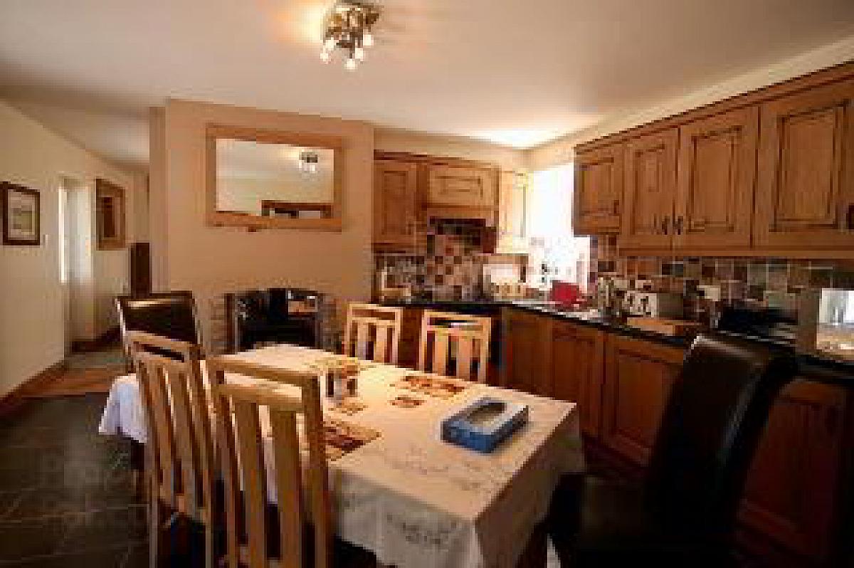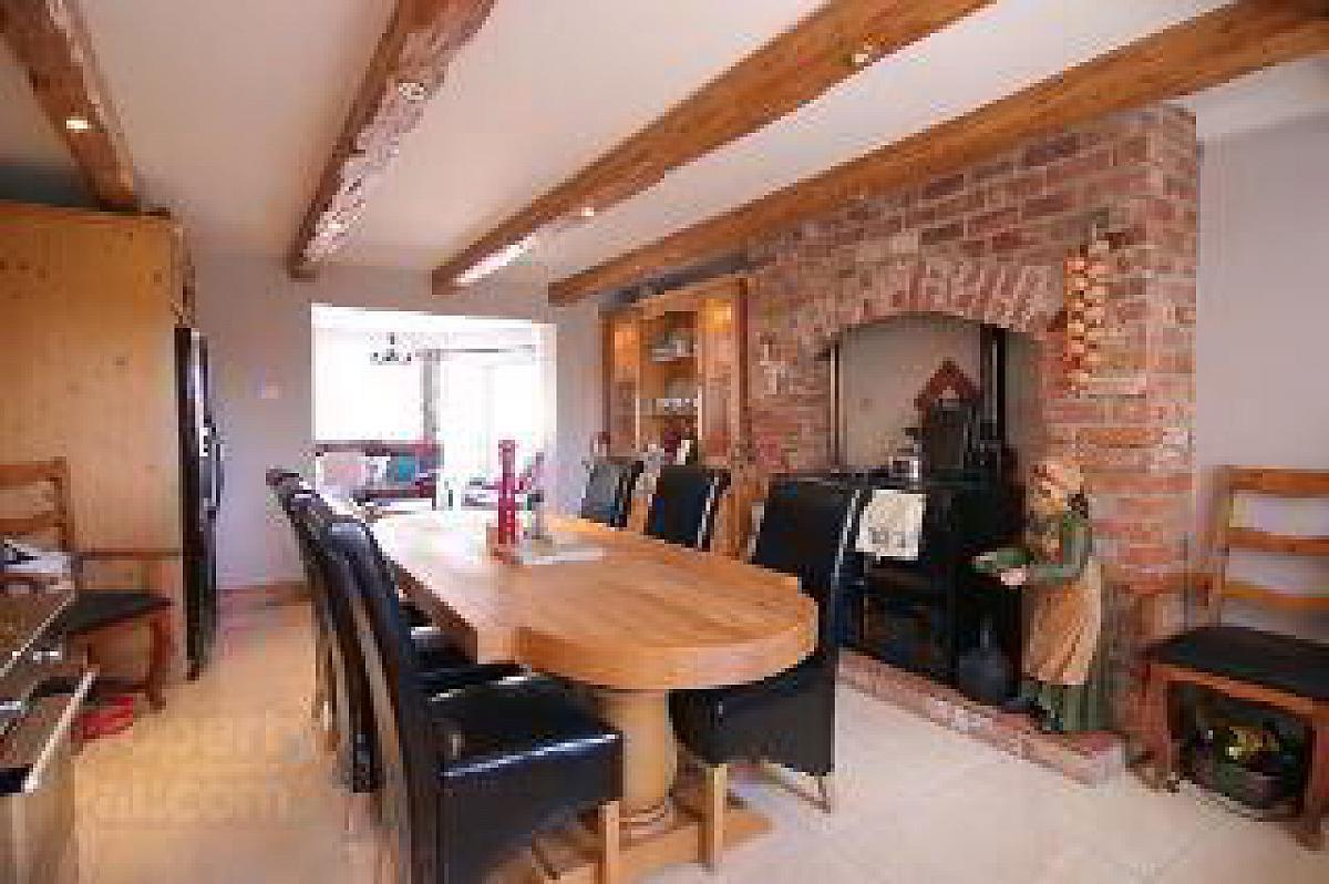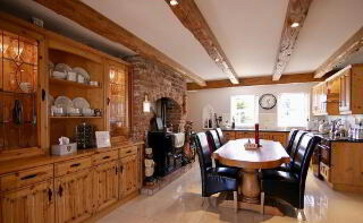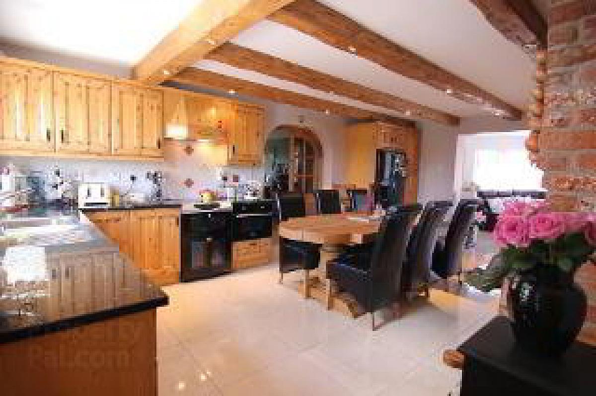 With an extensive range of solid wooden eye and low level units with part tiled walls, a feature redbrick housing for Rayburn oil fired range, fitted sideboard and dresser with display shelving and lights, housing and plumbing for American style fridge freezer, integrated microwave, bowl and a half stainless steel sink unit, feature beam ceiling, recessed lights, polished ceramic tiled flooring,