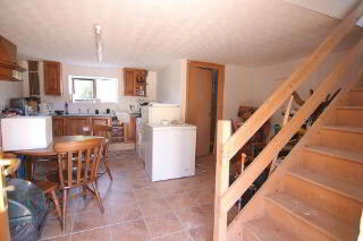 With a range of eye and low level kitchen units, stainless steel sink unit, cloak room with a WC, wash hand basin and tiled flooring. Stairs to the first floor.