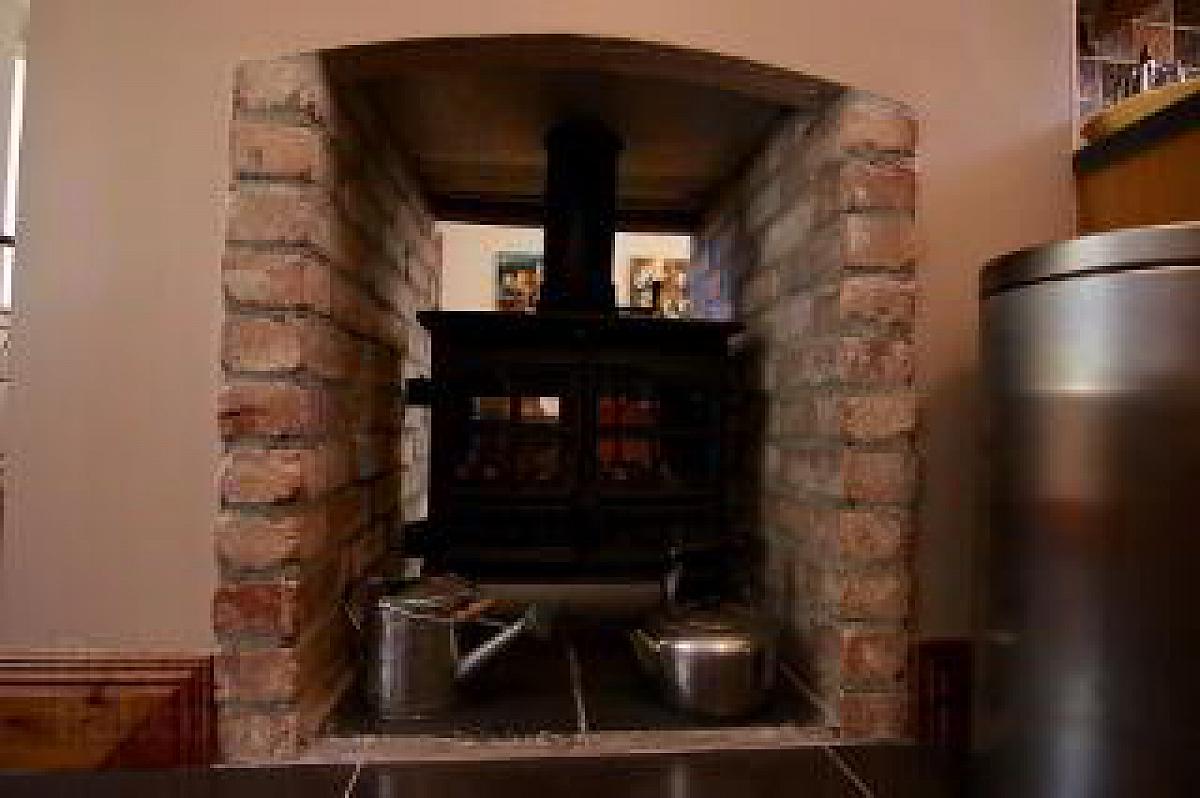 With a redbrick fireplace with wooden over mantle, dual sided open multi fuel stove, solid wooden flooring, open square archway to Kitchen & Dining Room.