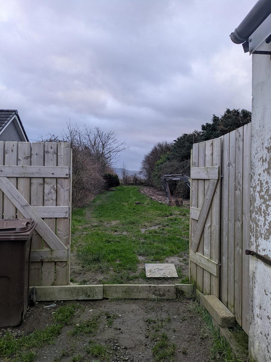Large stoned rear yard enclosed by gates with additional garden to rear
