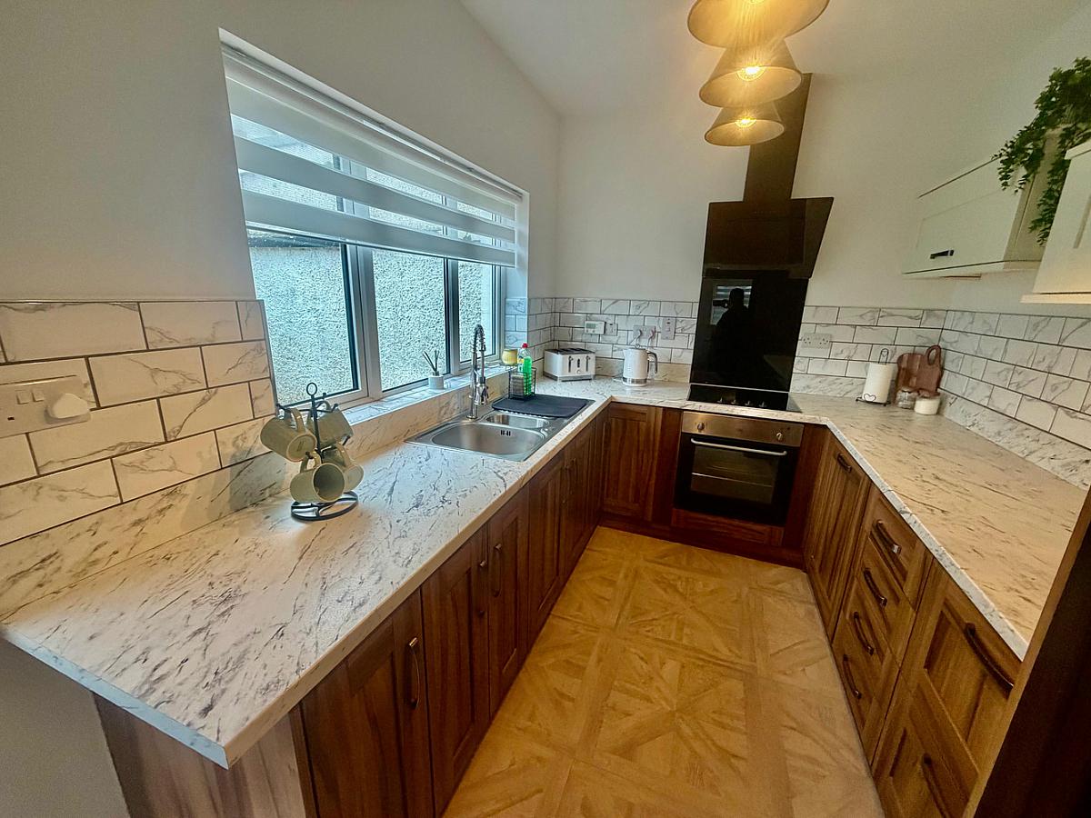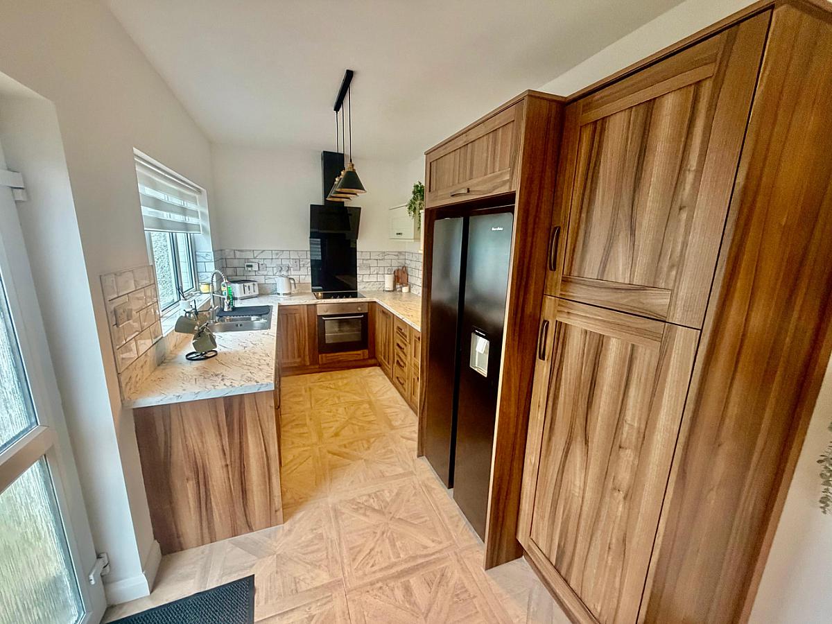 258 x 115 Excellent range of Walnut units with worktops to include stainless steel sink unit and mixer tap. Built in electric oven with matching ceramic hob along with extractor fan. Tiled flooring. uPVC rear door leading to spacious rear yard.