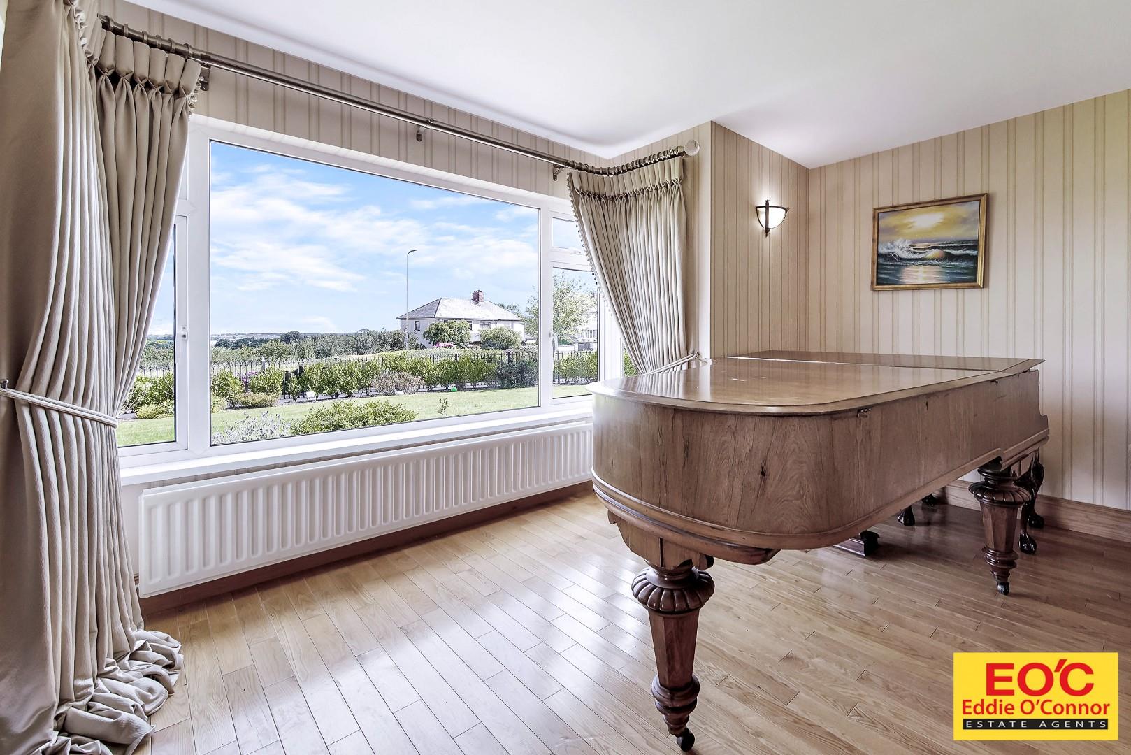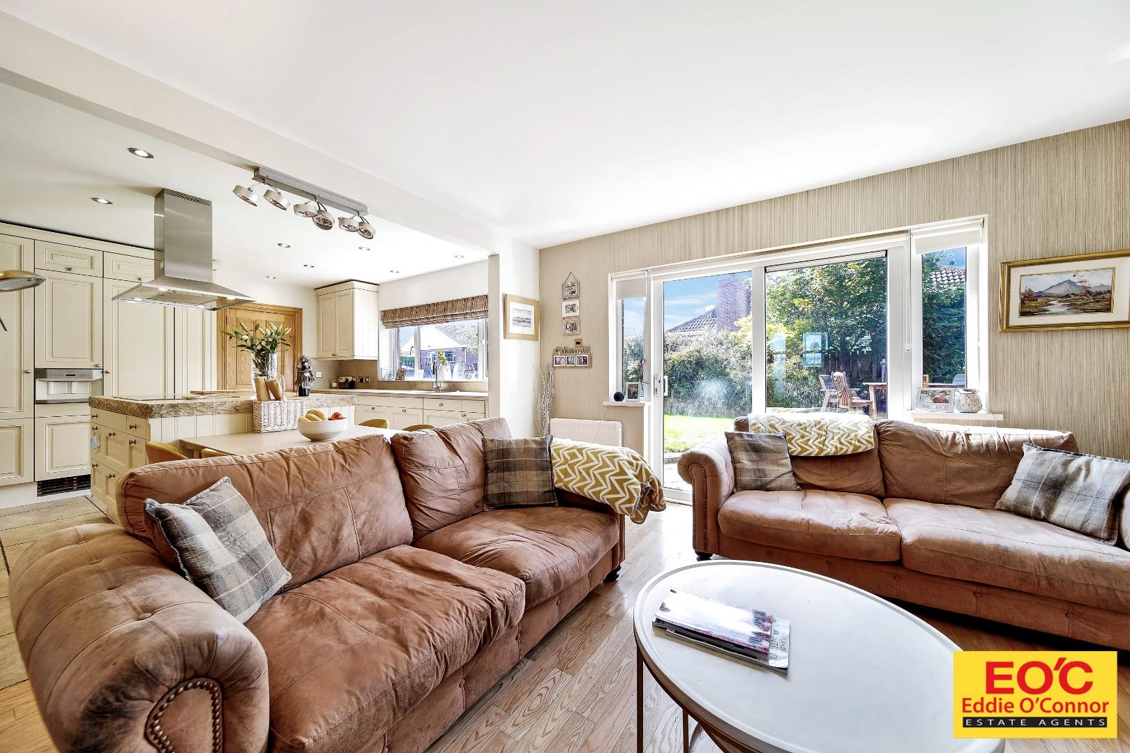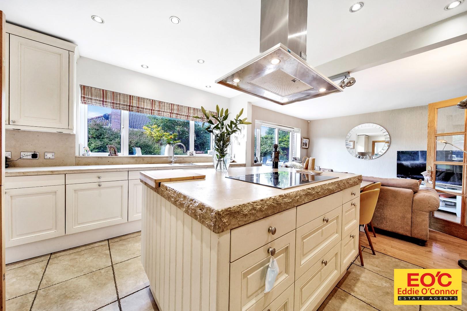 This large bright room has a Sematic Houseworks Kitchen, with polished Lime stone worktop and Island. The Island has an Induction Hob and stainless steel extractor above. The kitchen has integrated double ovens, Fridge freezer, Dish washer, Filter water tap and stainless steel 11/2 tub sinks with Limestone draining area. There is an attached breakfast bar seating area, recessed lights, fully tiled floor area in kitchen and wooden floor in dining area, sliding door to garden and patio area at rear.