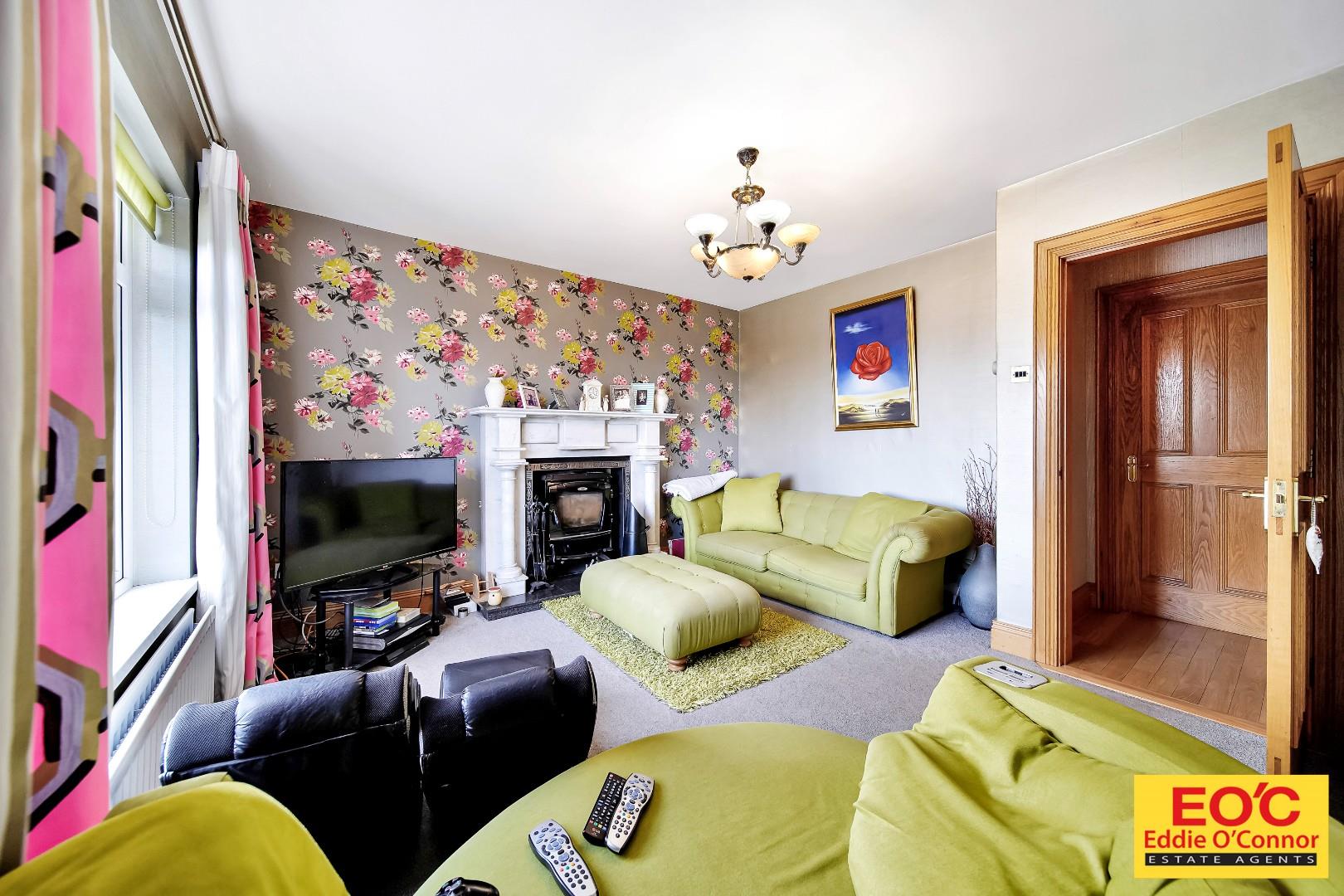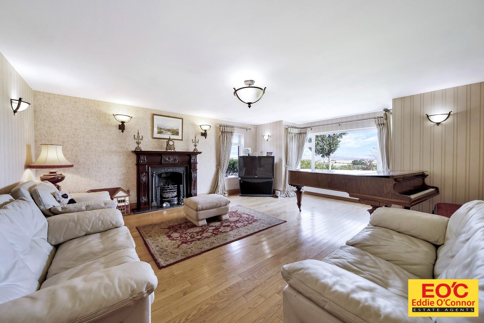 Large room with views of Foyle, solid wood flooring, gas fire with mahogany fireplace and granite hearth. Double doors to dining room.