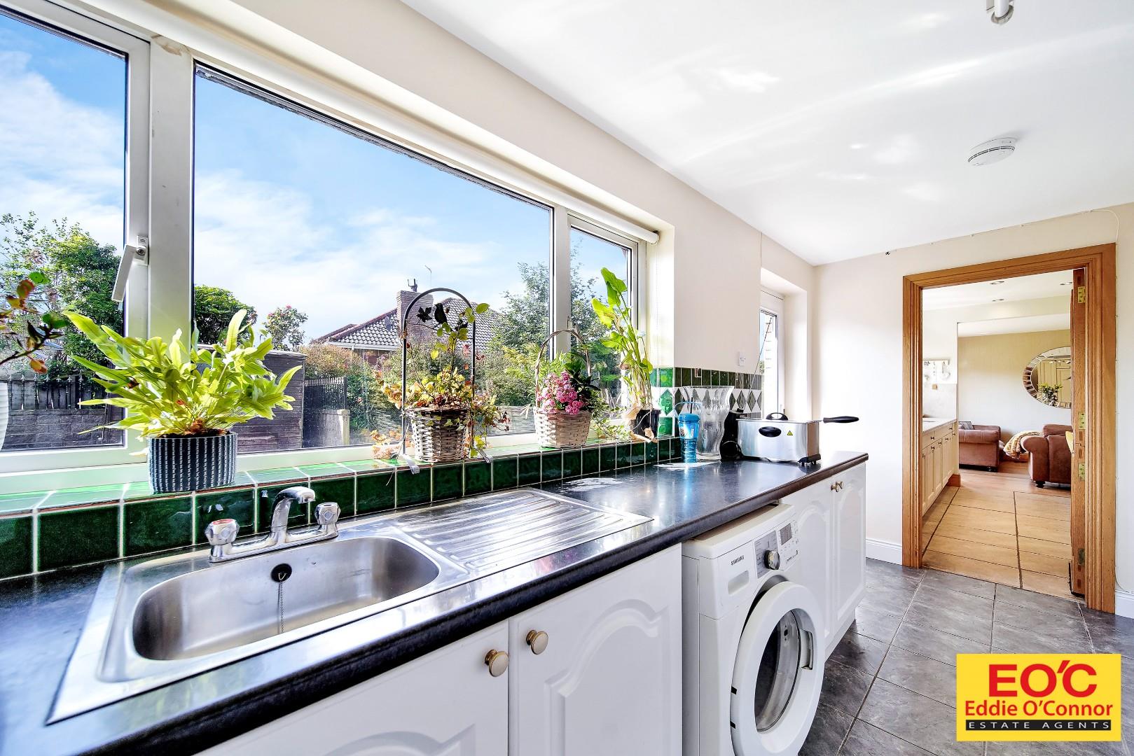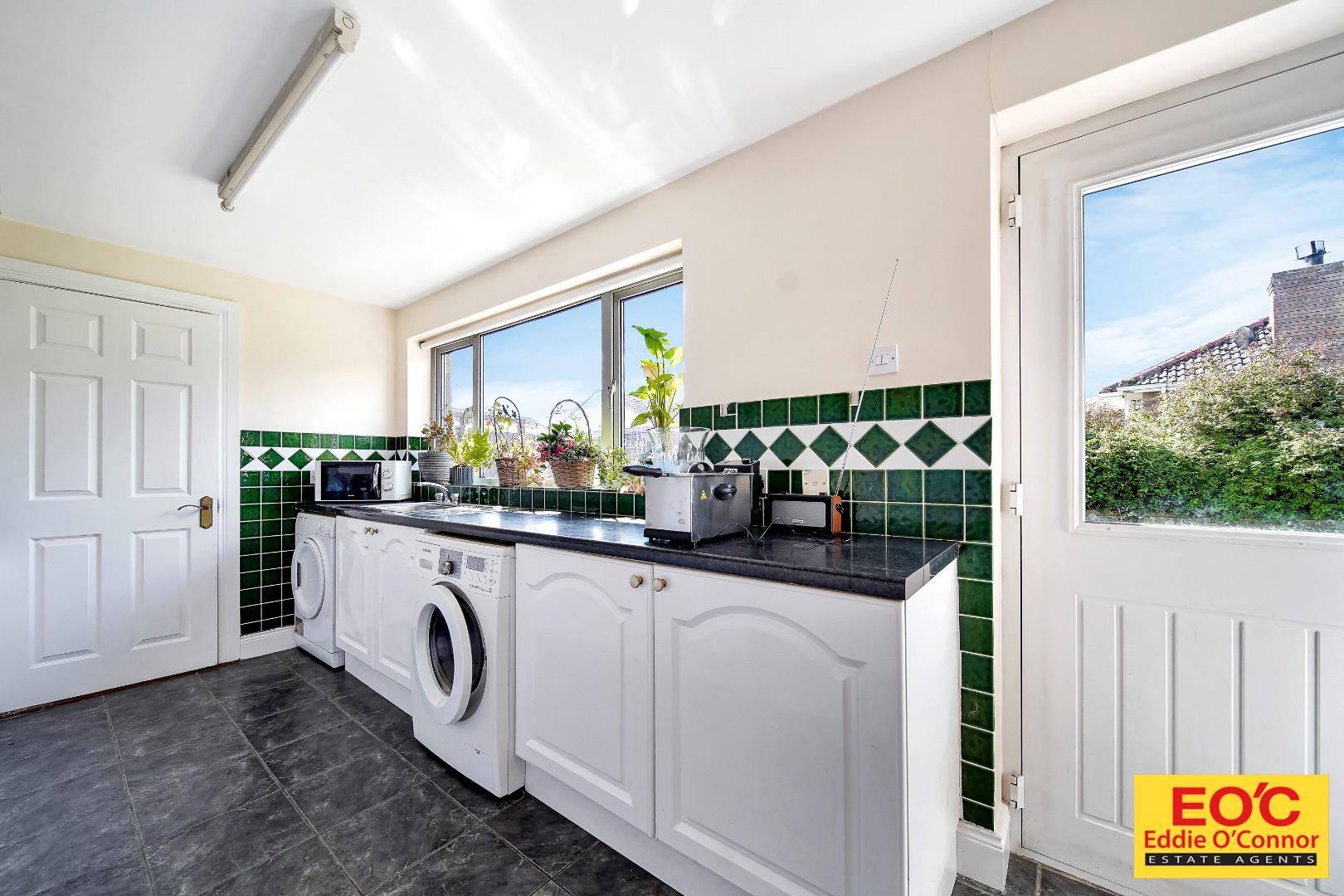 High and low level units , with stainless steel sink and drainer, plumbed for washing machine and dryer, fully tiled floor and part tile wall, door to Boiler room. Door to double garage and door to rear garden.