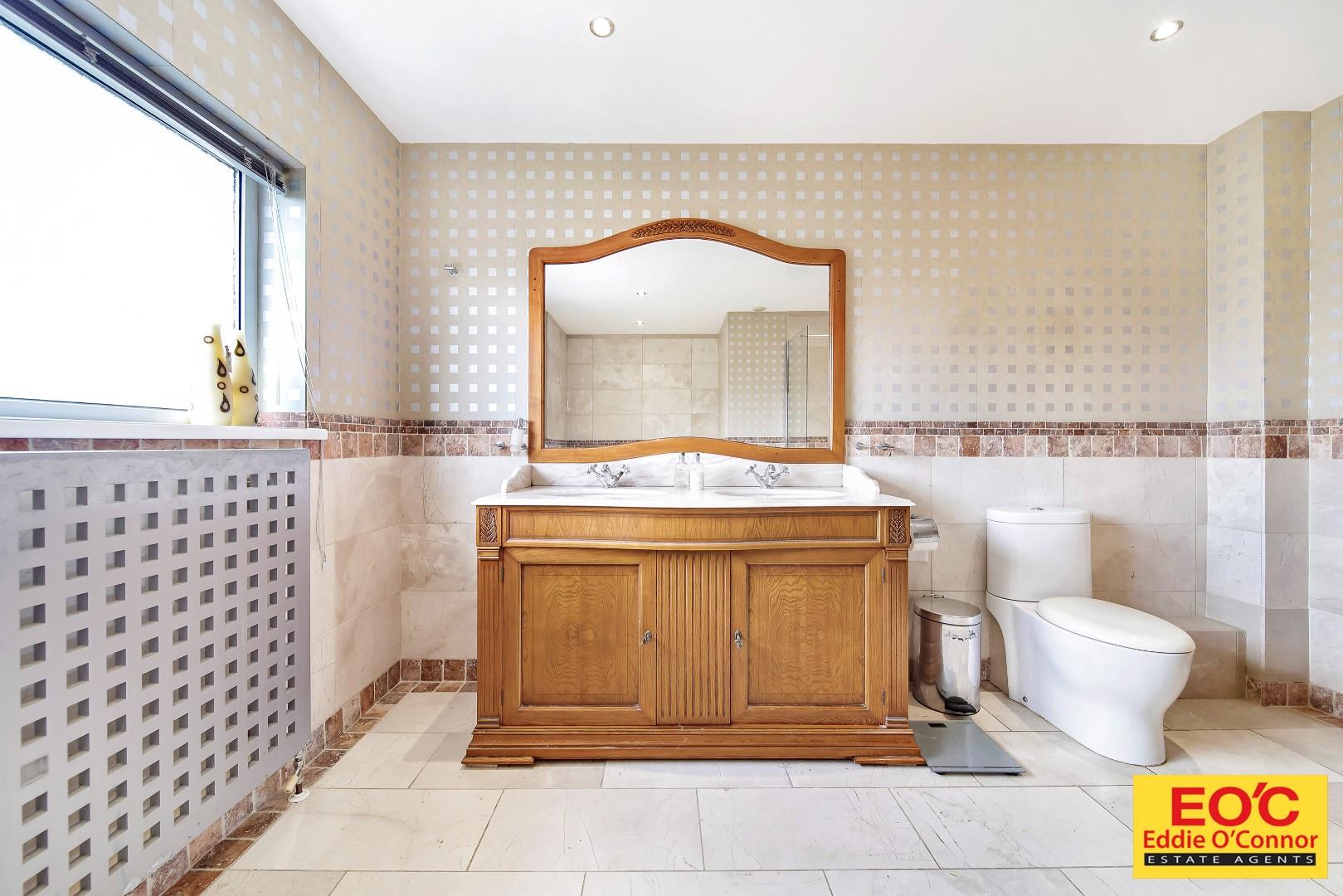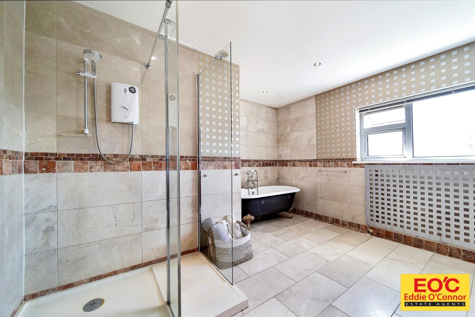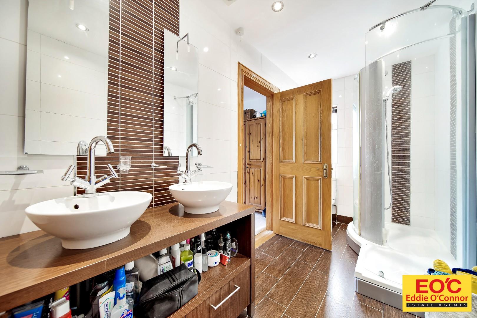 En-suite is Jack and Jill serving 2 rooms, It has a fully tiled floor and wall, it has a pressure shower in a Roman cabinet and LFWC, and His and Hers wash hand basins and vanity unit with separate mirrors above. Extractor.