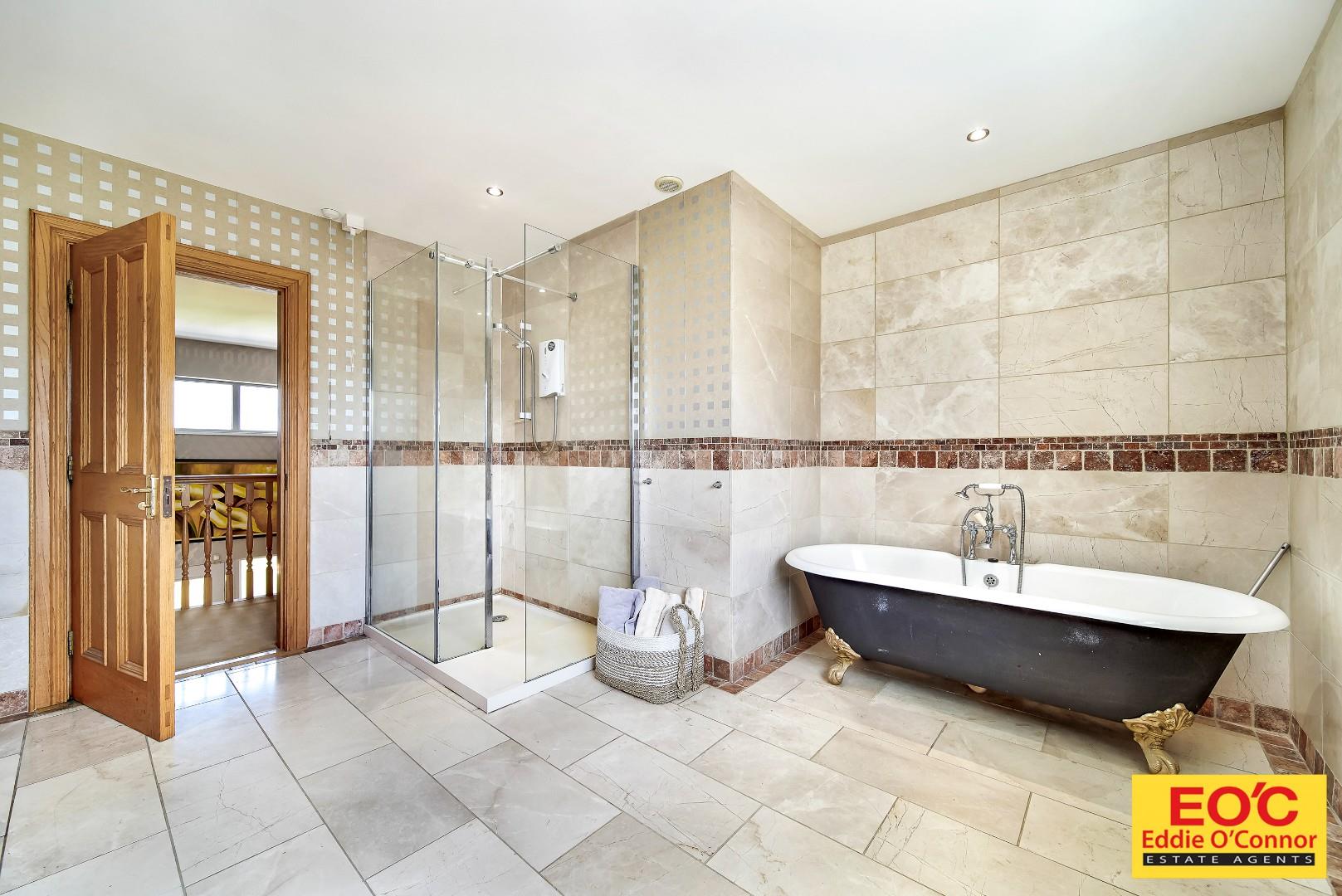 Modern spacious bathroom, fully tiled floor and part tiled wall, electric shower cubicle Roman style and free standing clawfoot bath, LFWC, His and her wash hand basins on vanity unit with mirror above. Extractor.