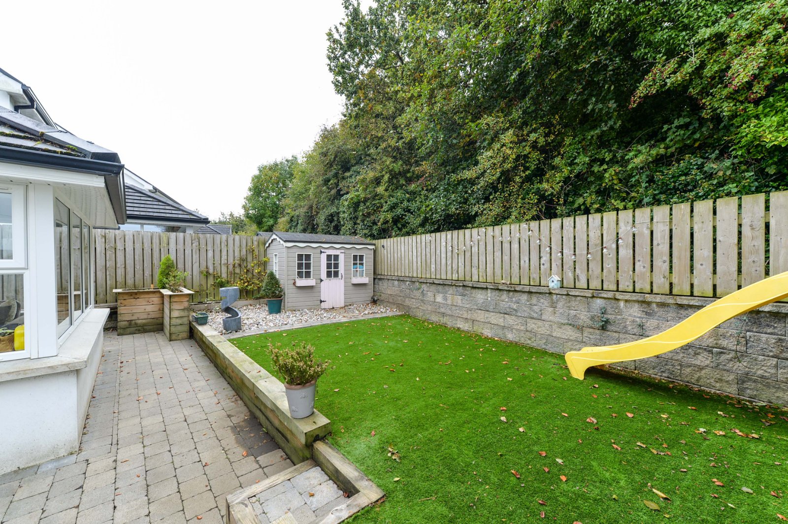 Enclosed private garden to rear, artificial grass, extensive brick pavioured patio area, boundary fencing, outside light, tap and power point, PVC oil tank.