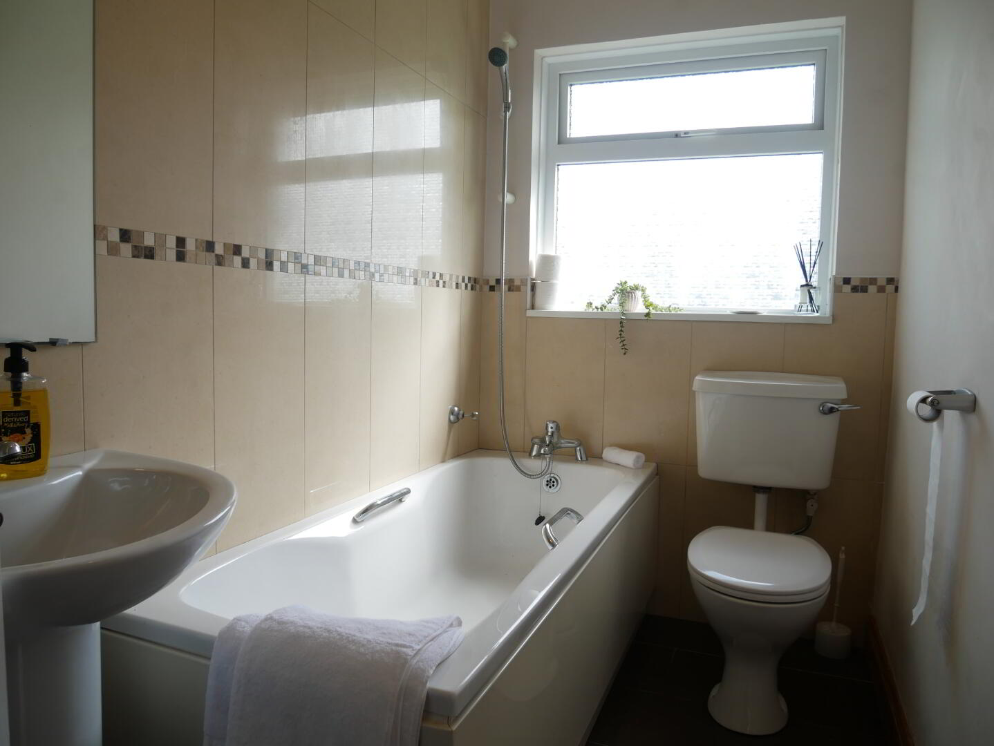 Bathroom – bath with handheld shower attachment over, WC, wash hand basin, part tiled walls, tiled floor.