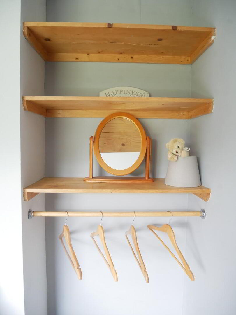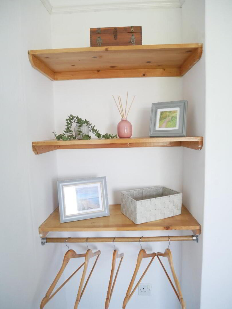 Bedroom 1 – 12'9" x 9'4" with built in opening shelving and clothes rails.