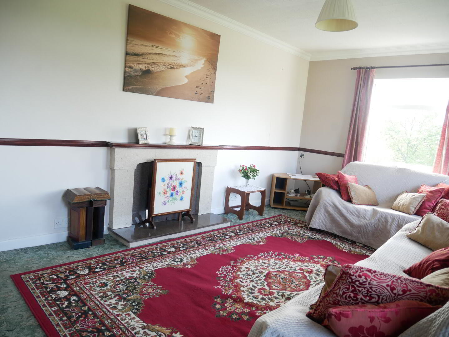 Lounge - 17'4" x 10'9" open fireplace with back boiler (untested) stone surround and hearth, coved ceiling, ceiling centrepiece.