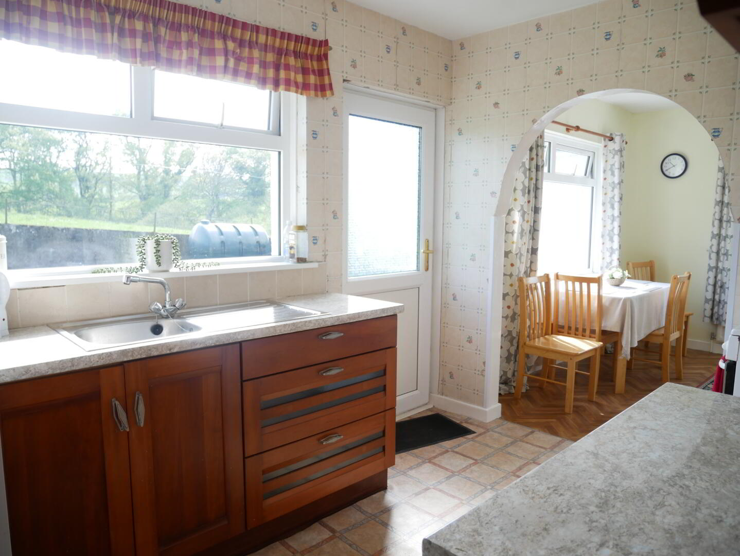 Kitchen - 11'2" x 7'7" fitted with eye and low level cherry wood units, stainless steel sink unit, tiled around worktop, built in larder, with plumbing for washing machine and shelving, space for cooker, hotpress, cushion flooring.