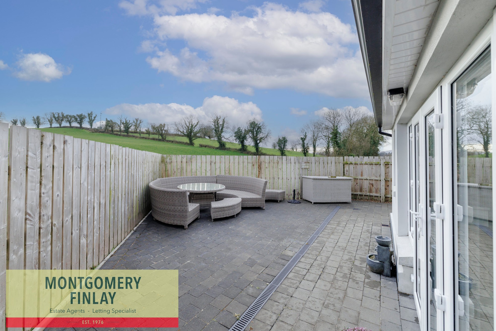 - South-facing rear patio with countryside views
