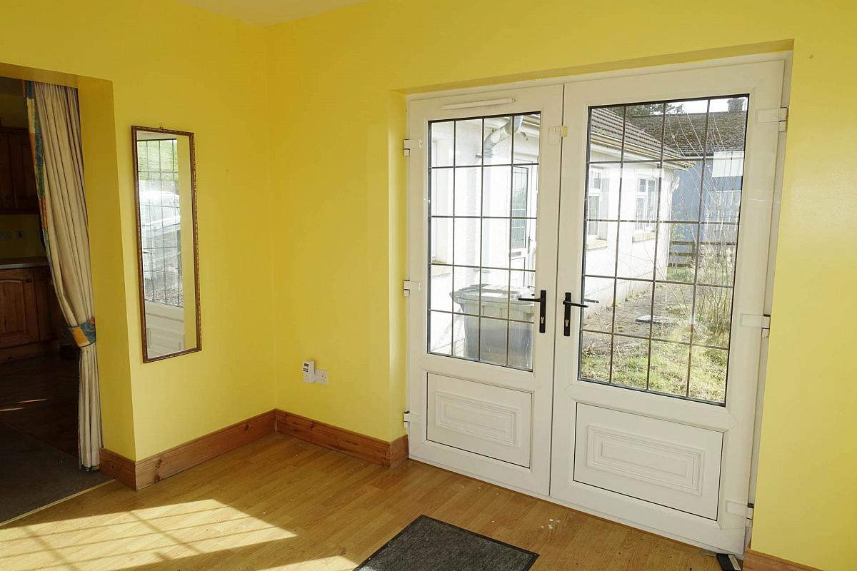 PVC exterior patio doors with glazed inset, direct access to paved patio area.