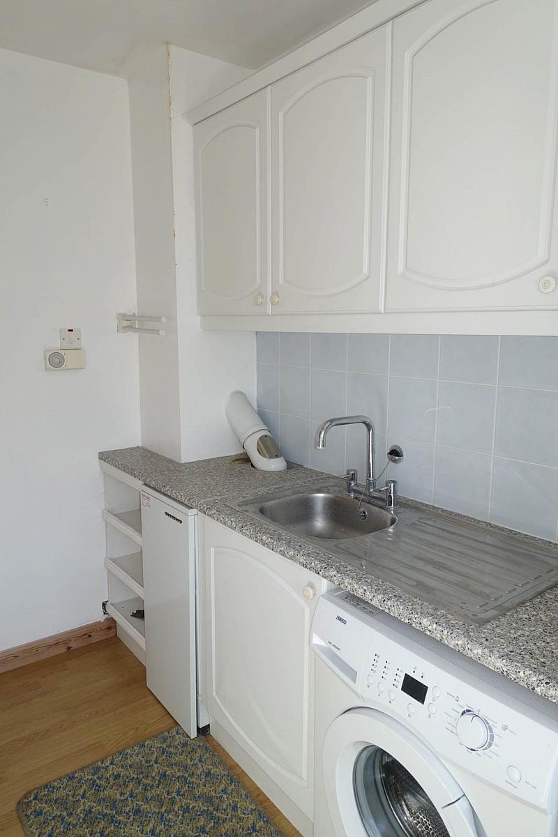 Range of high & low level units, plumbed for washing machine, wc, s.s. sink unit, boiler unit, PVC exterior door with glazed inset.