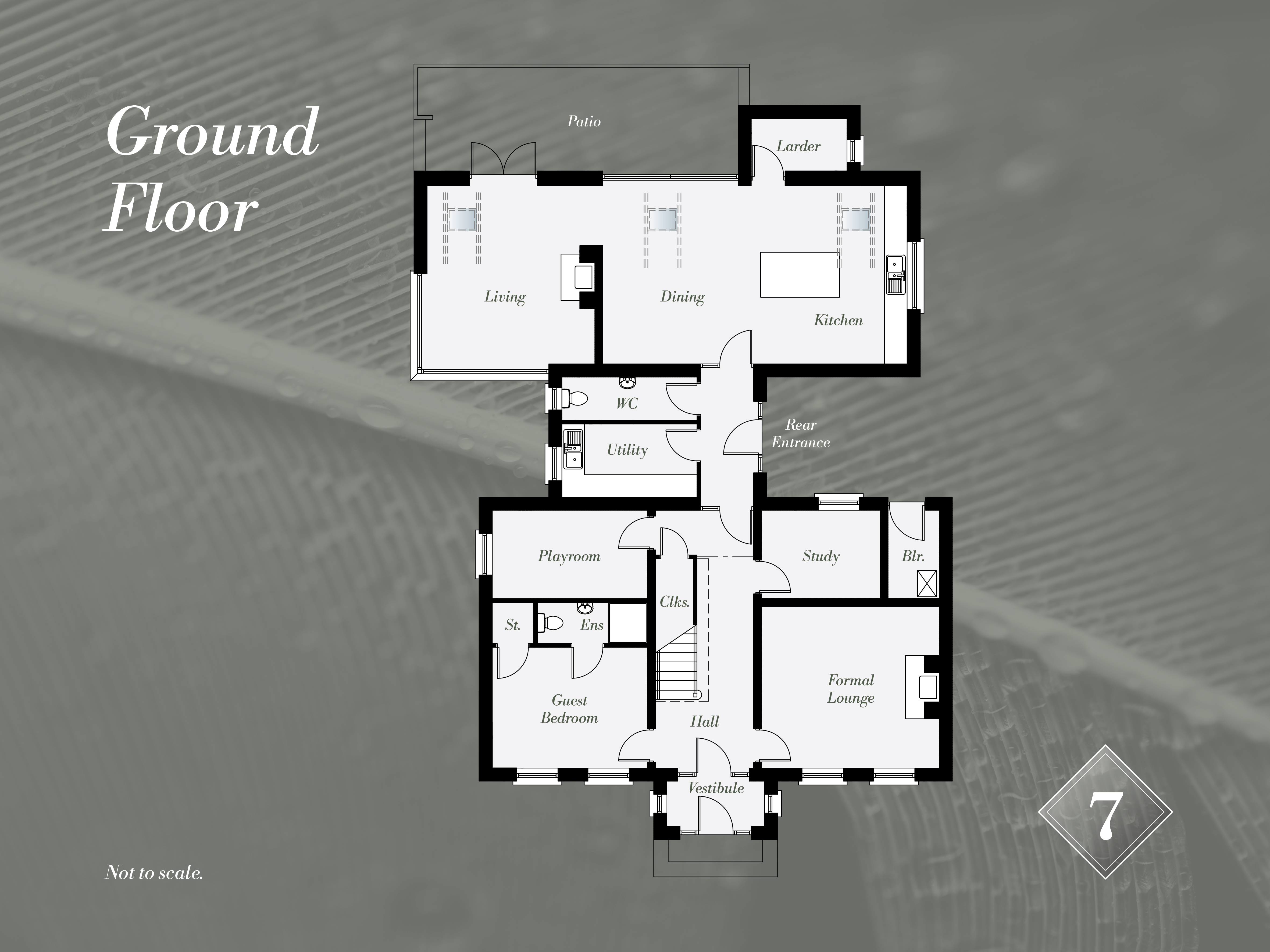 - Choice of tiling / wood to entrance hall, kitchen / living / dining area, utility, larder and WC