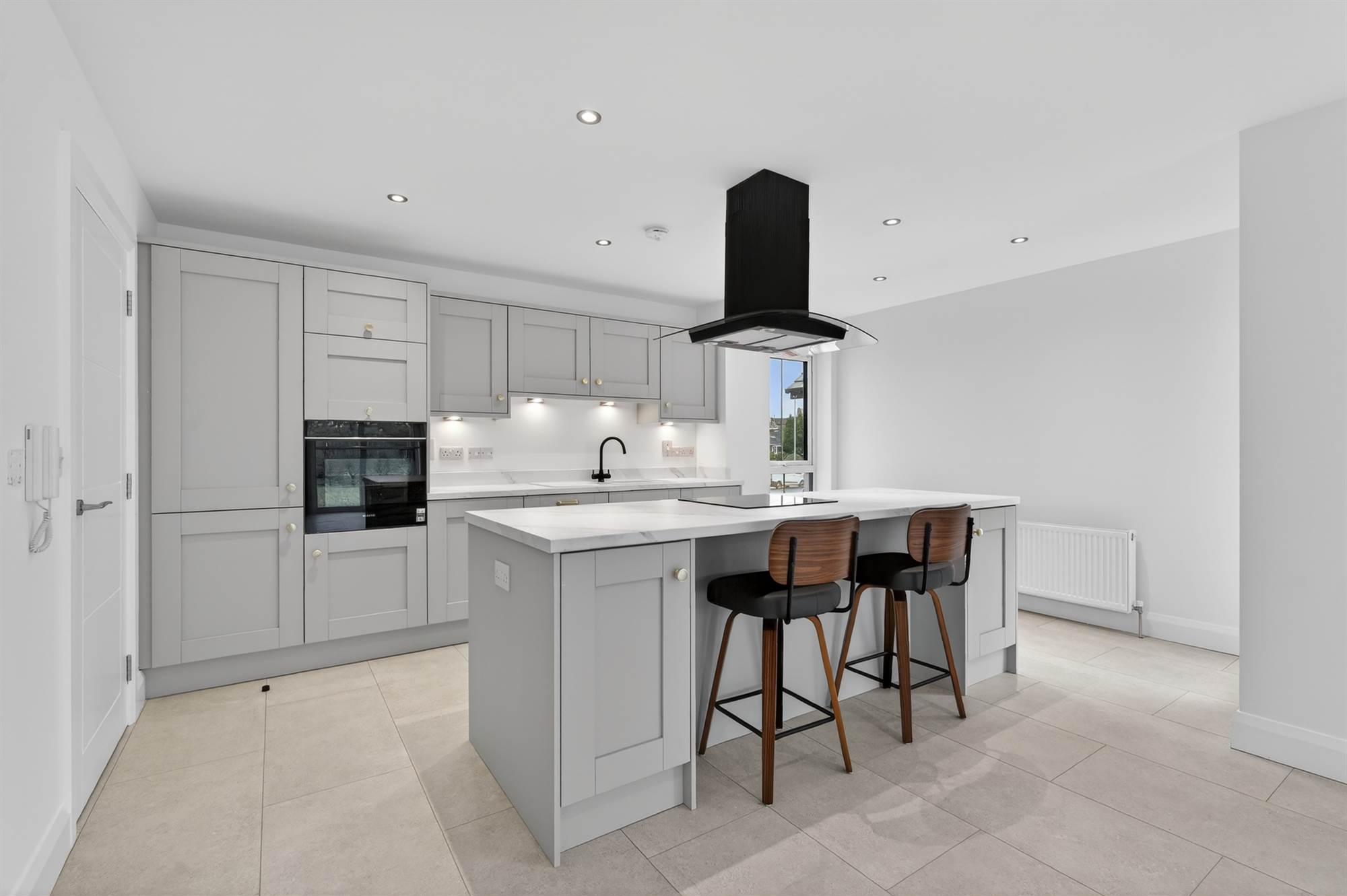 Integrated appliances to include hob, stainless steel electric oven, extractor hood, integrated dishwasher, integrated fridge/freezer and washer dryer