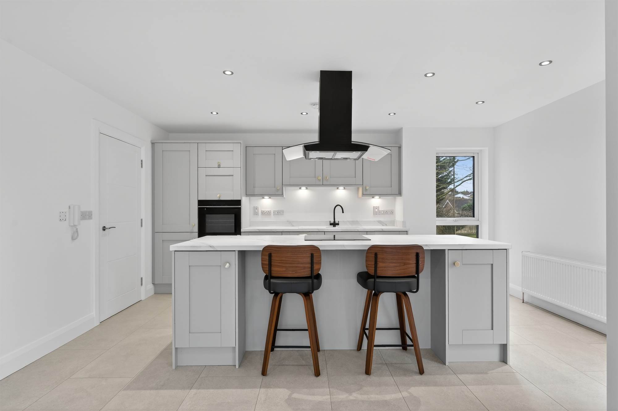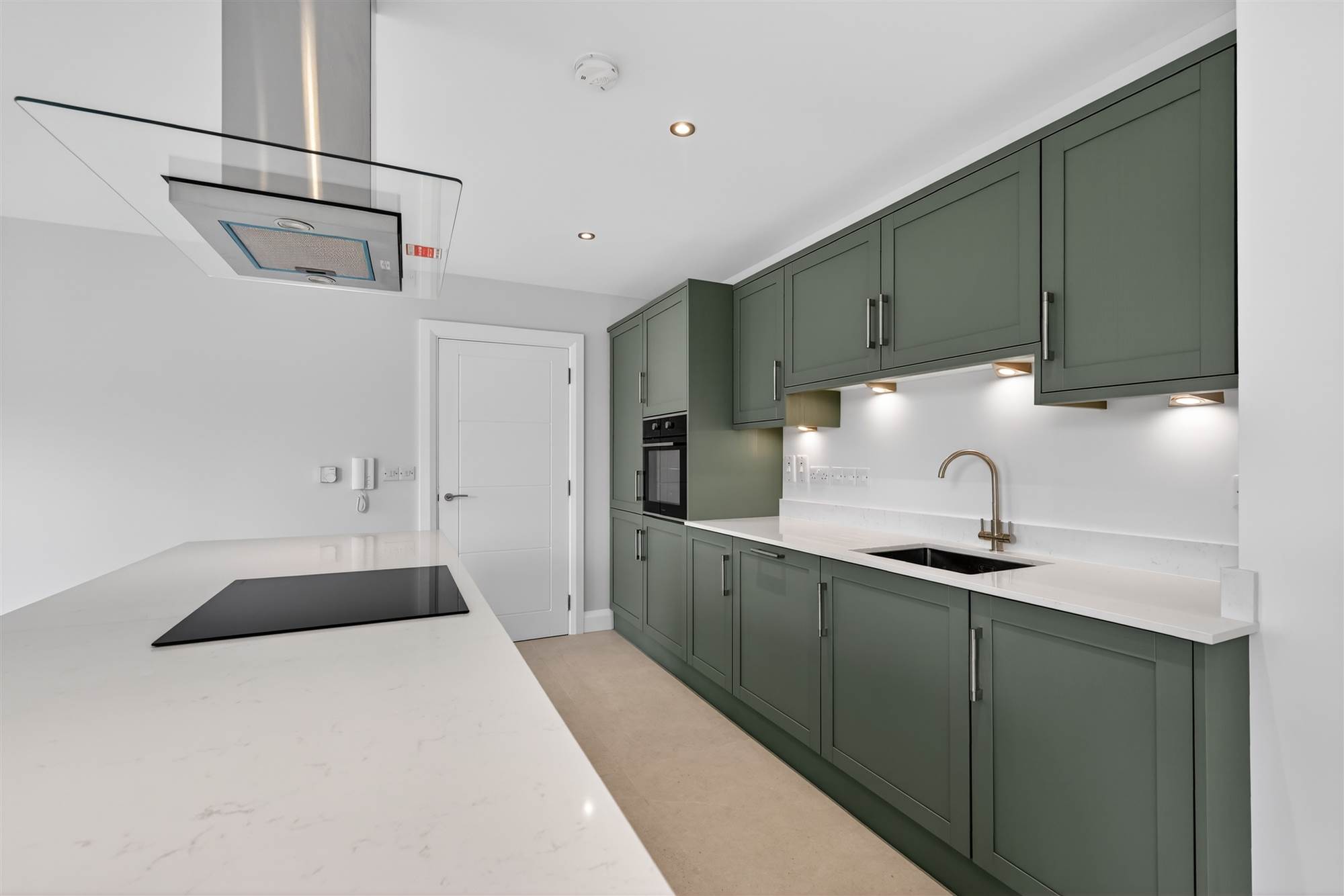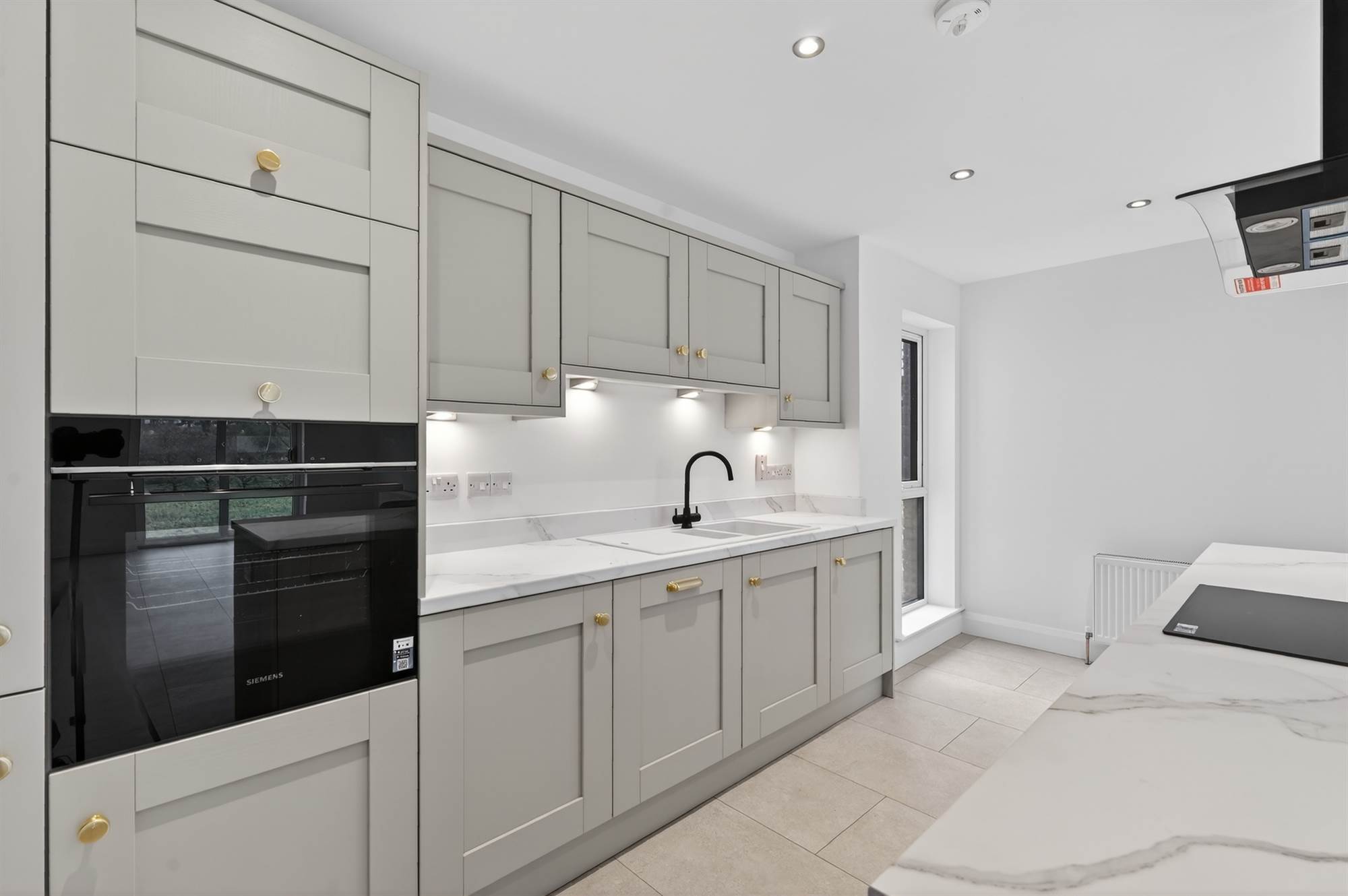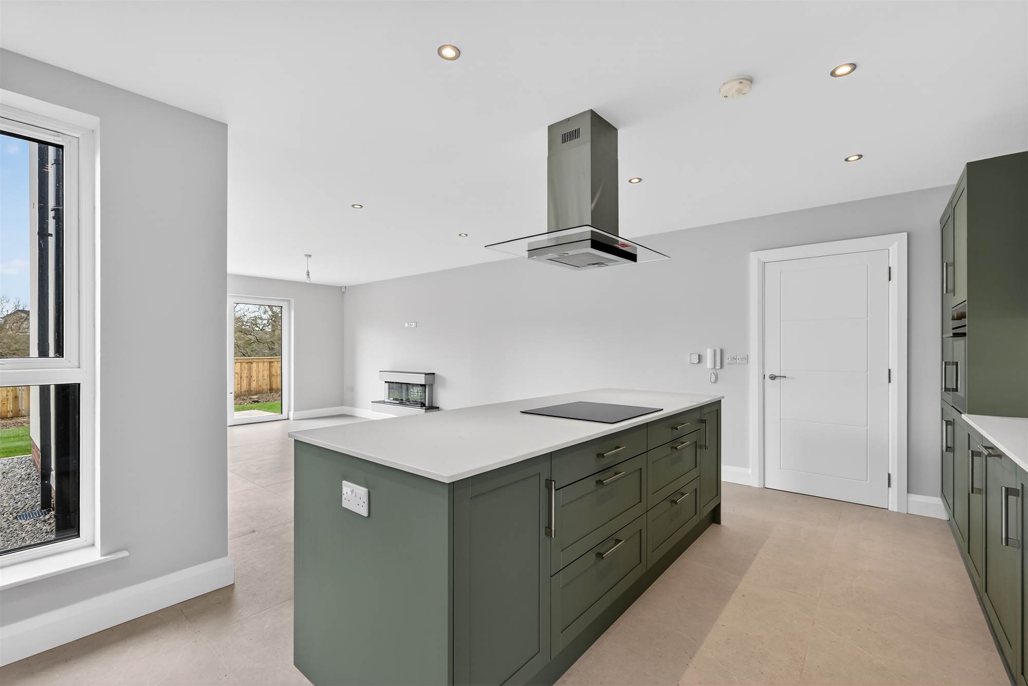 Integrated appliances to include hob, stainless steel electric oven, extractor hood, integrated dishwasher, integrated fridge/freezer and washer dryer