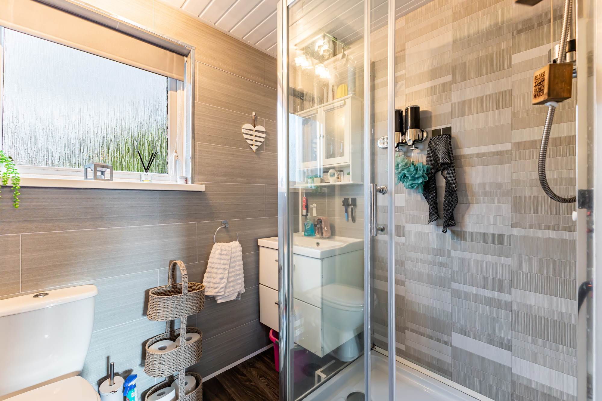 White suite comprising low flush wc with push button, floating wash hand basin with chrome mixer tap and built-in vanity unit, corner shower unit with glass sliding door, shower with chrome thermostatic control valve and telephone attachment, PVC cladded tongue and groove ceiling, chrome heated towel rail, laminate wood effect flooring.