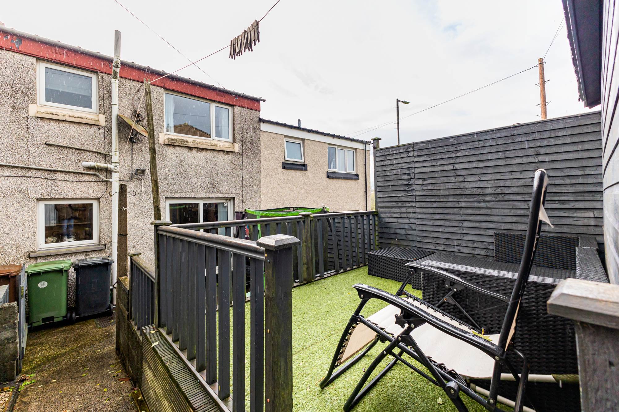 Enclosed rear garden with raised timber decking and seating area, access to oil tank and boiler, outside tap and light, access gate to rear for bins.