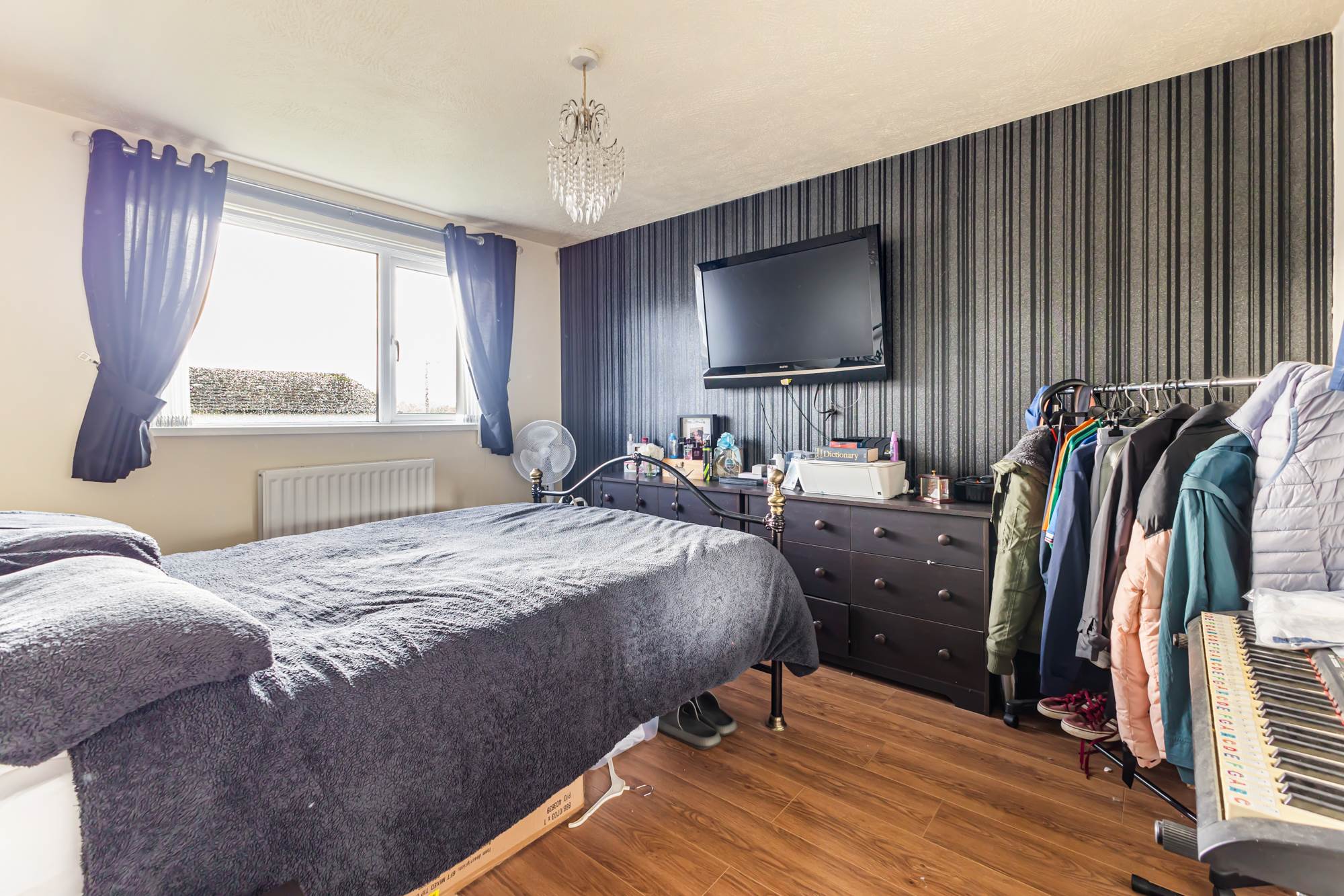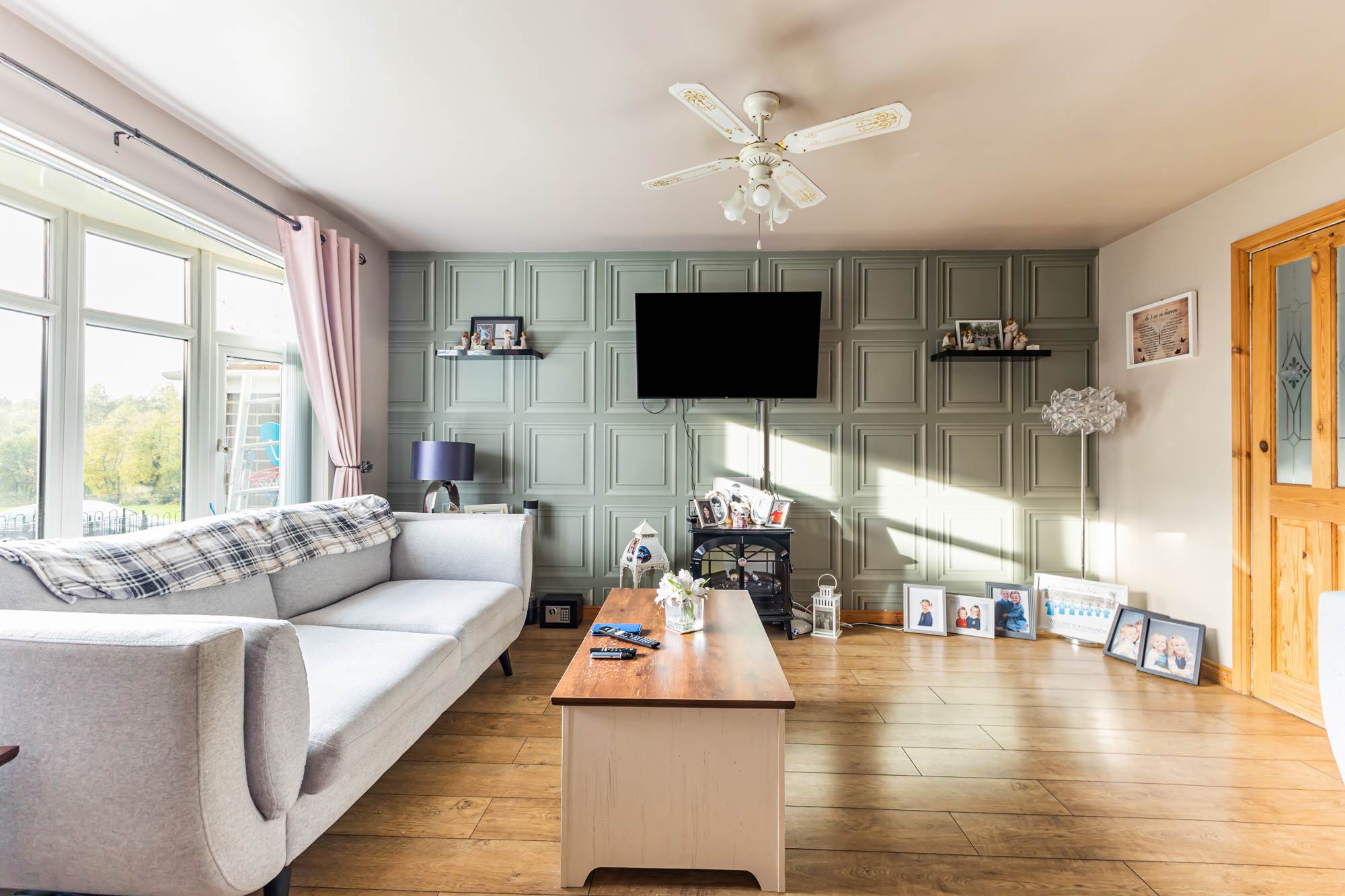Outlook to front, laminate wood effect flooring, picture rail, built-in storage.