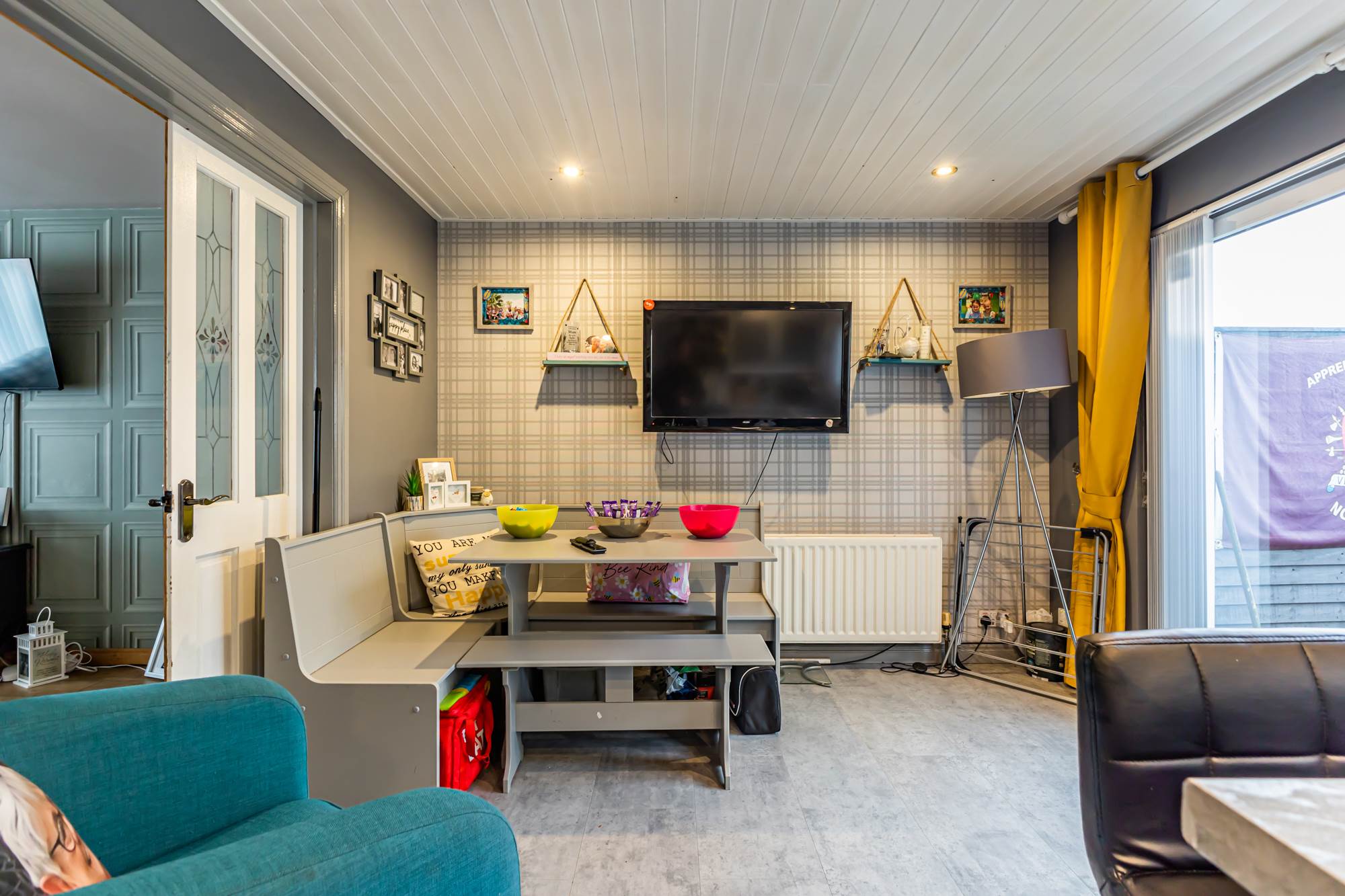 (at widest points). Range of high and low level units, laminate worktops, stainless steel single drainer sink unit with side drainer and chrome mixer tap, plumbed for washing machine, built-in dishwasher, built-in fridge freezer, space for range cooker, tiled splashback, built-in extractor fan, pine tongue and groove ceiling. Ample space for casual dining. laminate flooring, breakfast bar, uPVC double glazed sliding doors to rear patio garden.