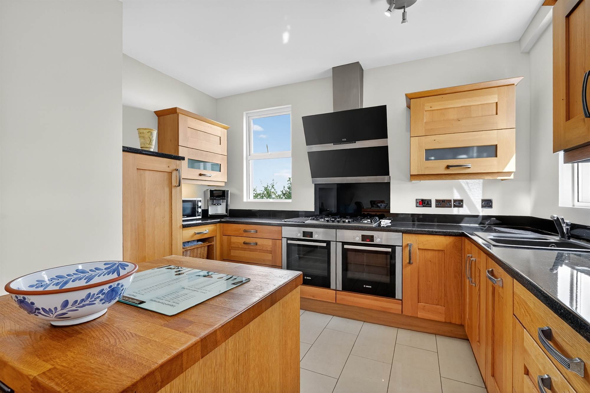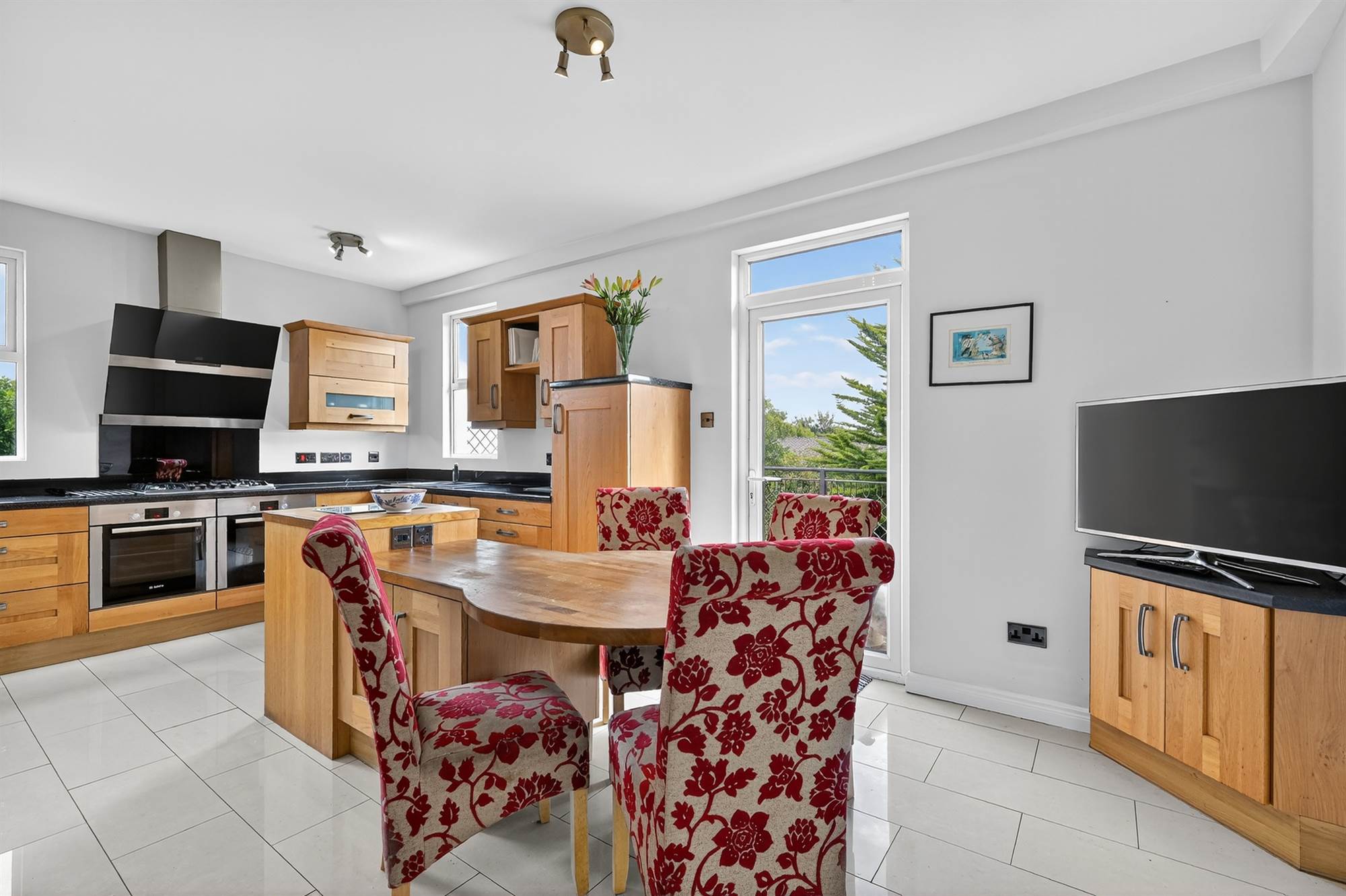 (at widest points). Fully fitted kitchen with range of high and low level units, worktops with upstand, inset sink with side drainer and chrome mixer tap, built-in double oven, built-in stainless steel gas hob with extractor fan and splashback, built-in Bosch fridge, freezer and dishwasher, tiled floor, breakfast island with power points and additional built-in storage with space for seating area, uPVC double glazed door to raised rear private balcony with private views and steel surrounding railings.