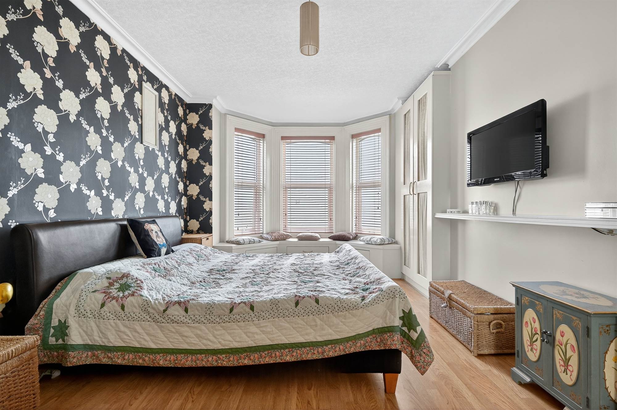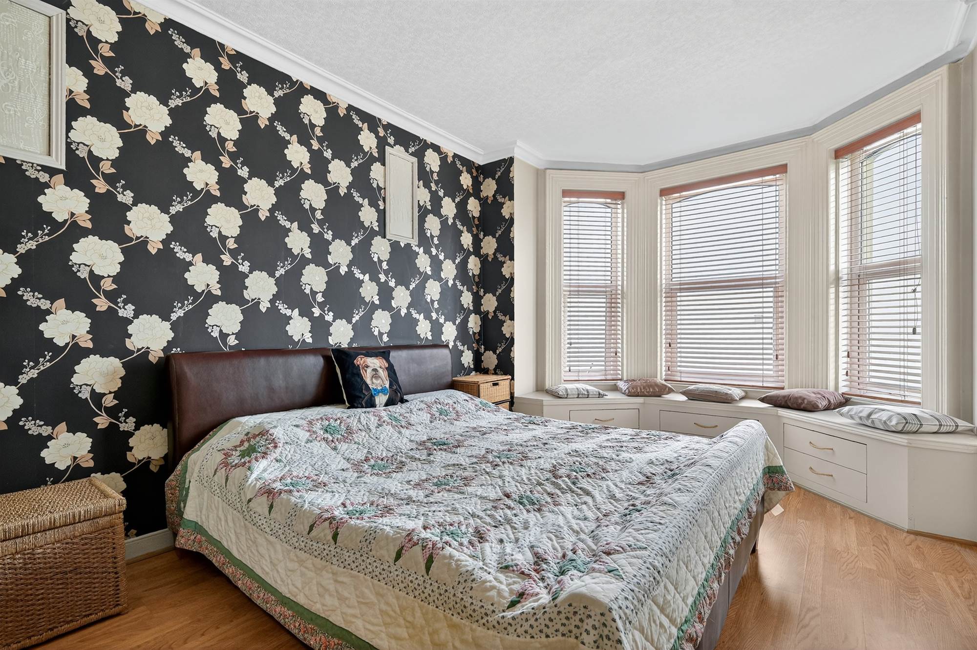 (at widest points). Bay window, outlook to side, range of built-in storage cabinets and wardrobes, laminate wood effect flooring, built-in seating area with additional under storage, cornice ceiling.