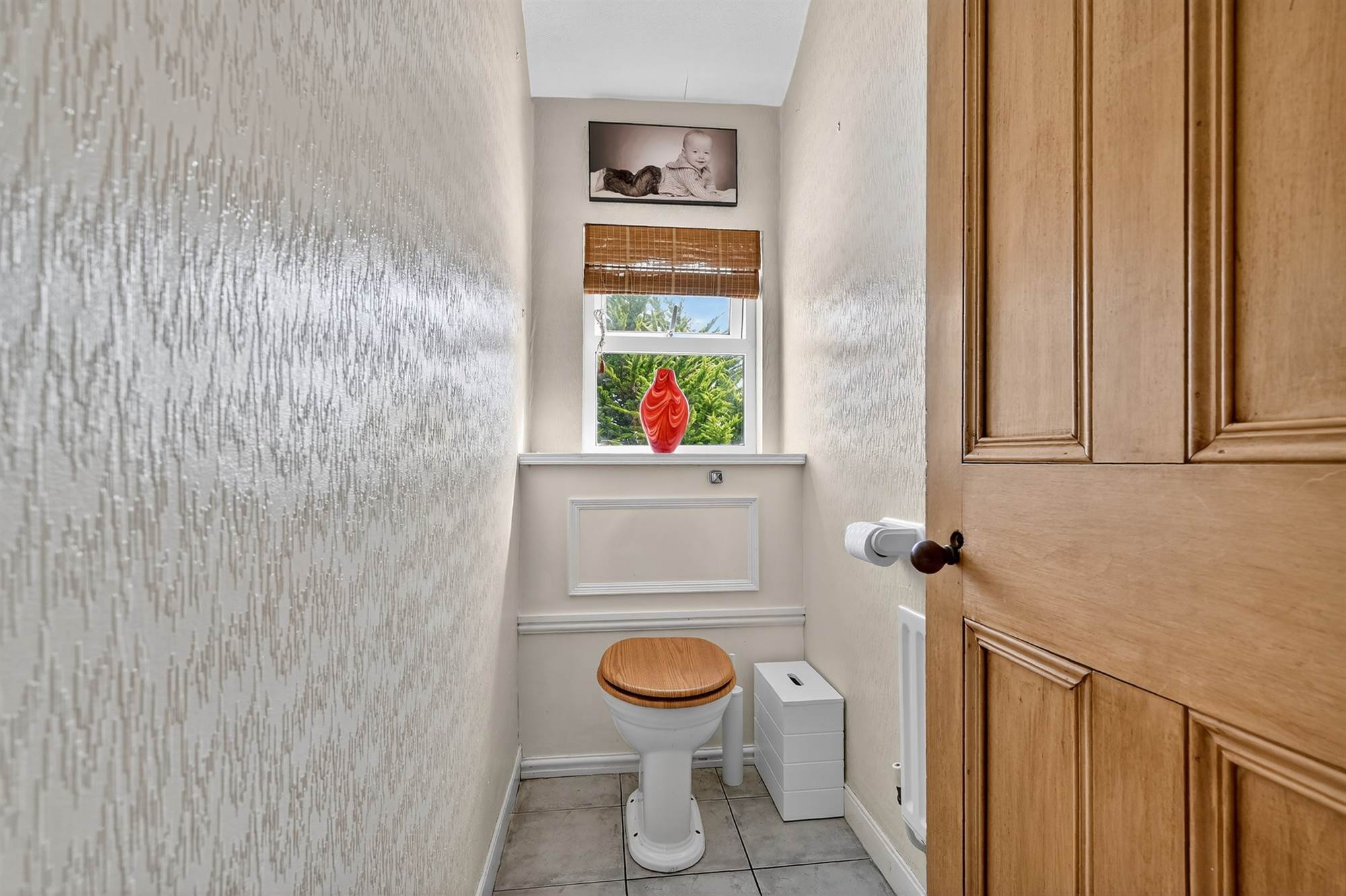 White suite comprising low flush wc with push button, picture window, tiled floor, radiator.