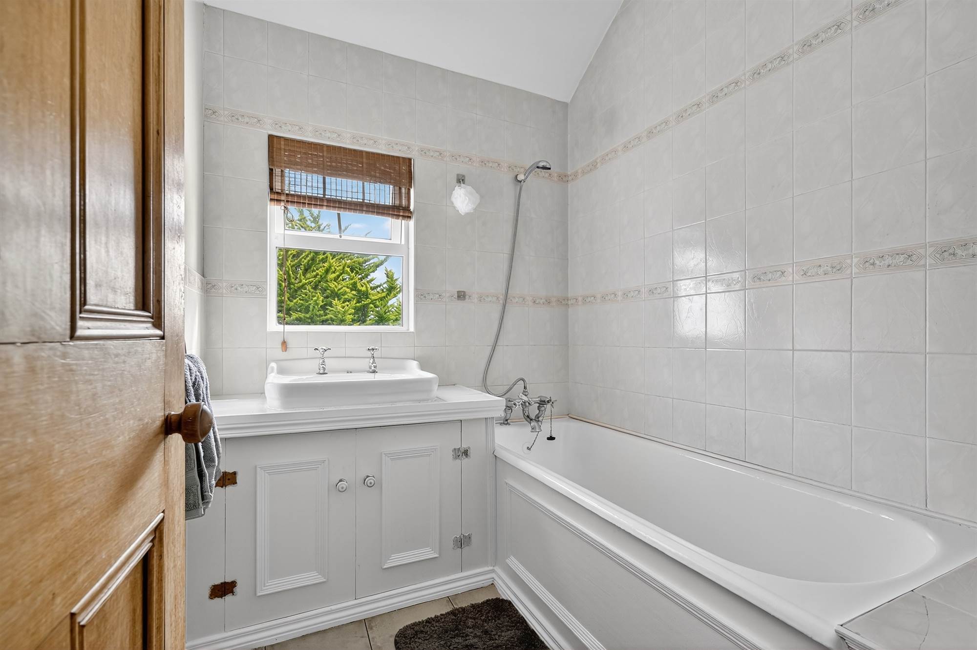 White suite comprising floating wash hand basin with chrome mixer tap and built-in vanity unit below, panelled bath with chrome mixer tap and telephone attachment, fully tiled walls and tiled floor, picture window.