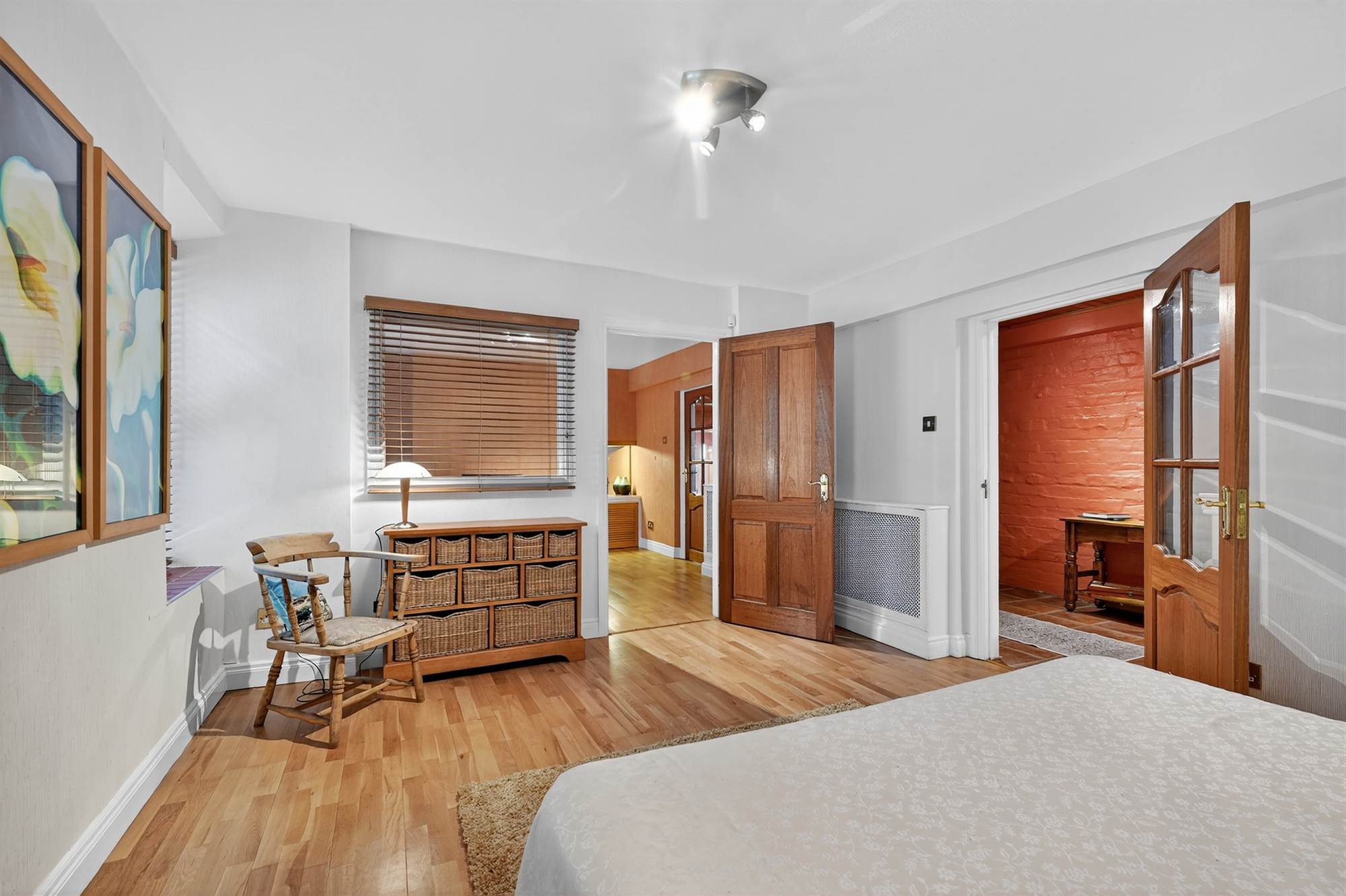 Laminate wooden flooring, cornice ceiling and ceiling rose.