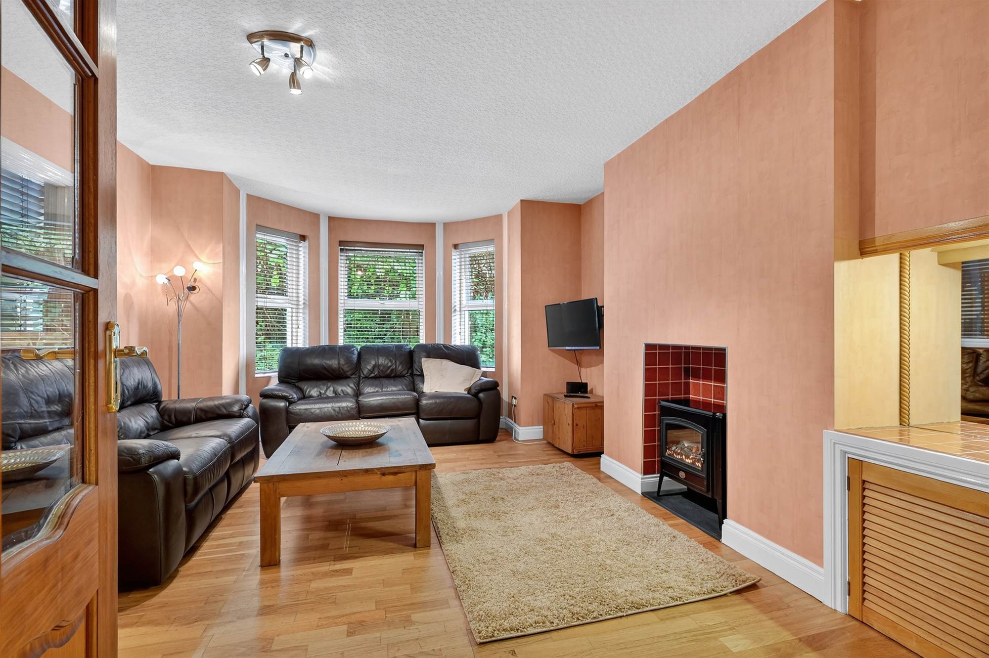 (at widest points). Outlook to side, laminate wood effect flooring, fireplace with cast iron inset and surround.