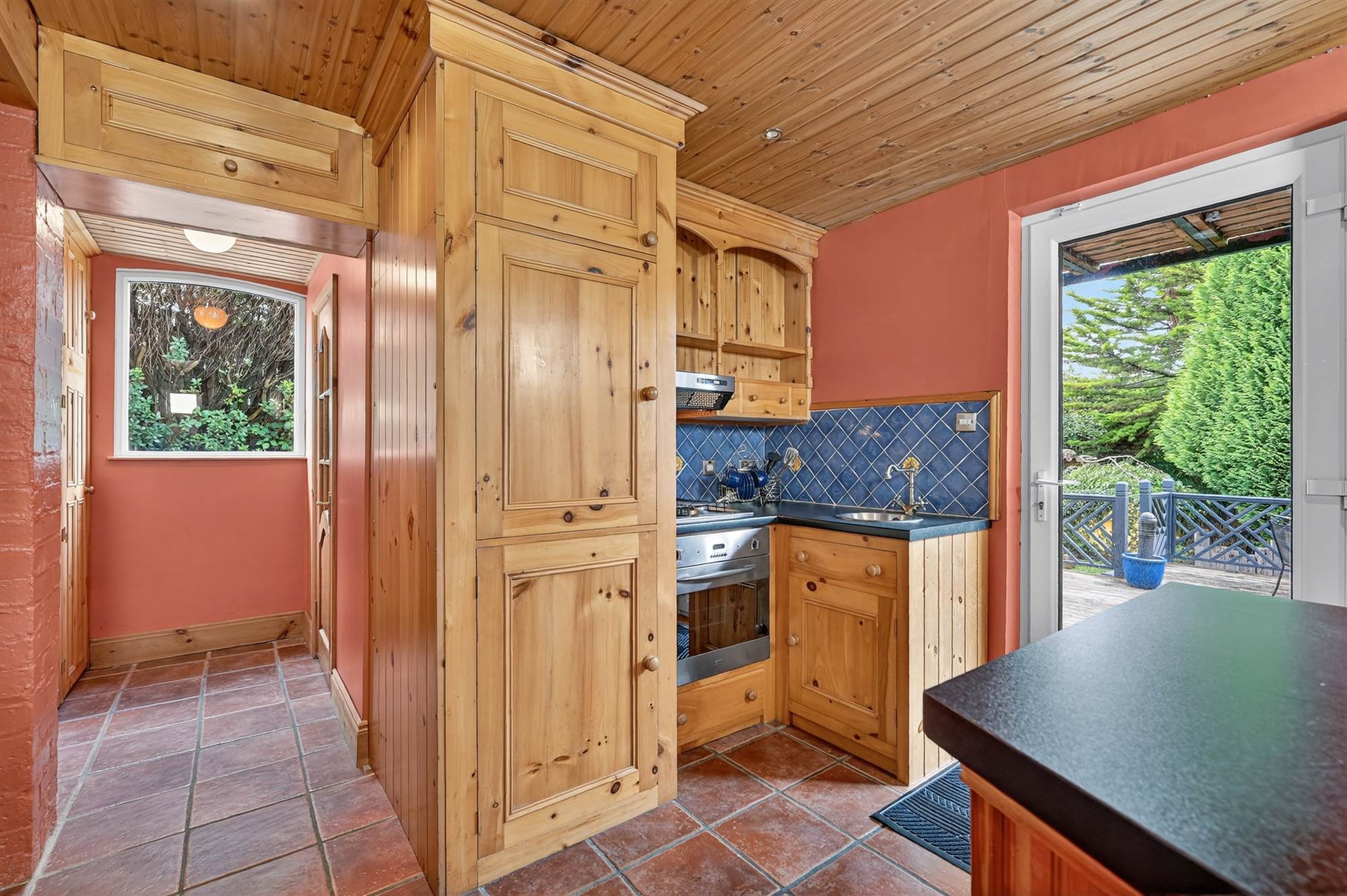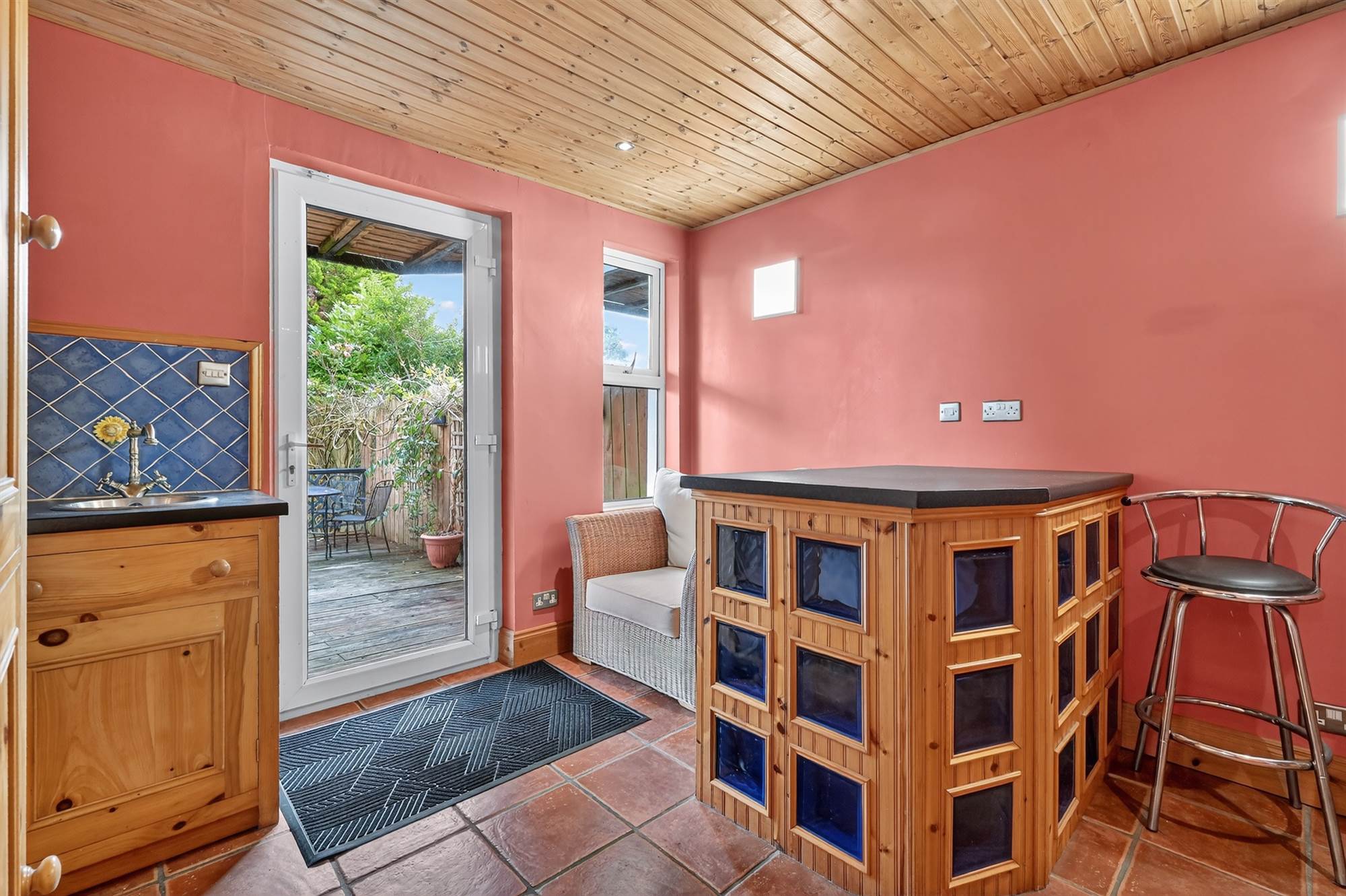 Range of solid oak wooden high and low level units, inset sink with chrome tap, gas hob with built-in oven and grill below, breakfast bar with space for seating area, tiled floor, uPVC double glazed door to rear garden, pine tongue and groove ceiling, low voltage recessed spotlights.