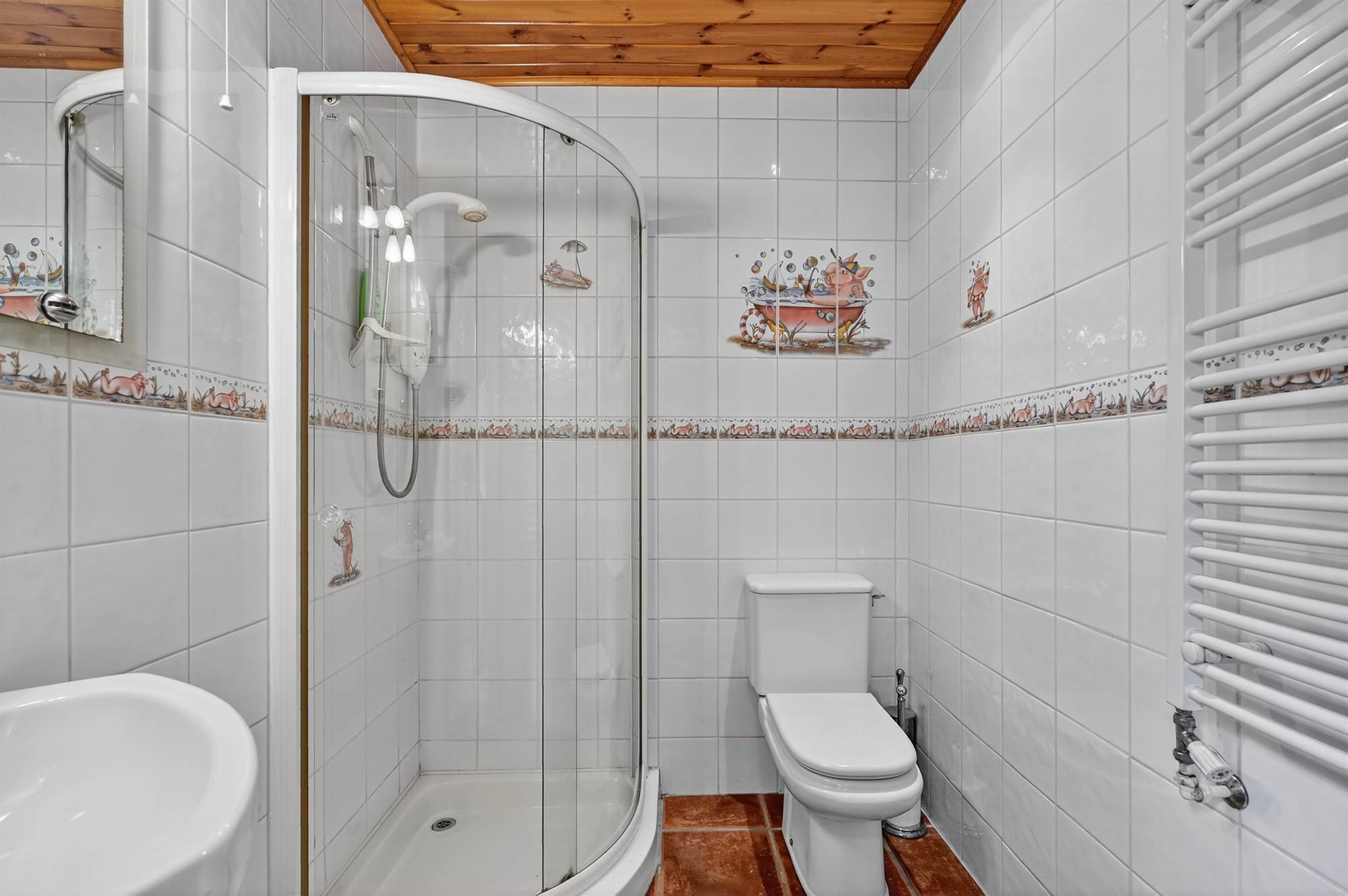 White suite comprising low flush wc, pedestal wash hand basin with chrome taps, corner shower unit with electric shower and telephone attachment, fully tiled walls, tiled floor, heated towel rail, pine tongue and groove ceiling.