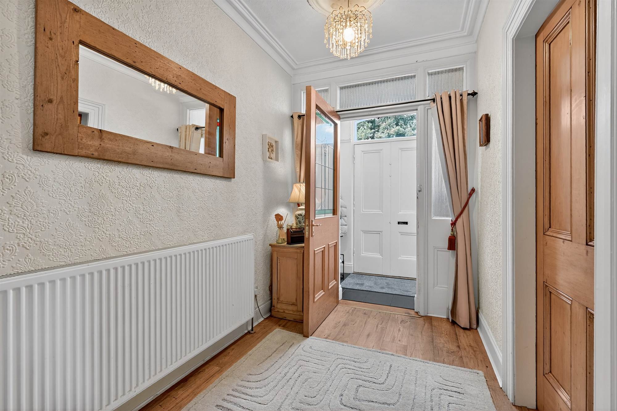 Tiled floor. Further glazed inner door with glazed lead detailing, glass top light and side light to . . .