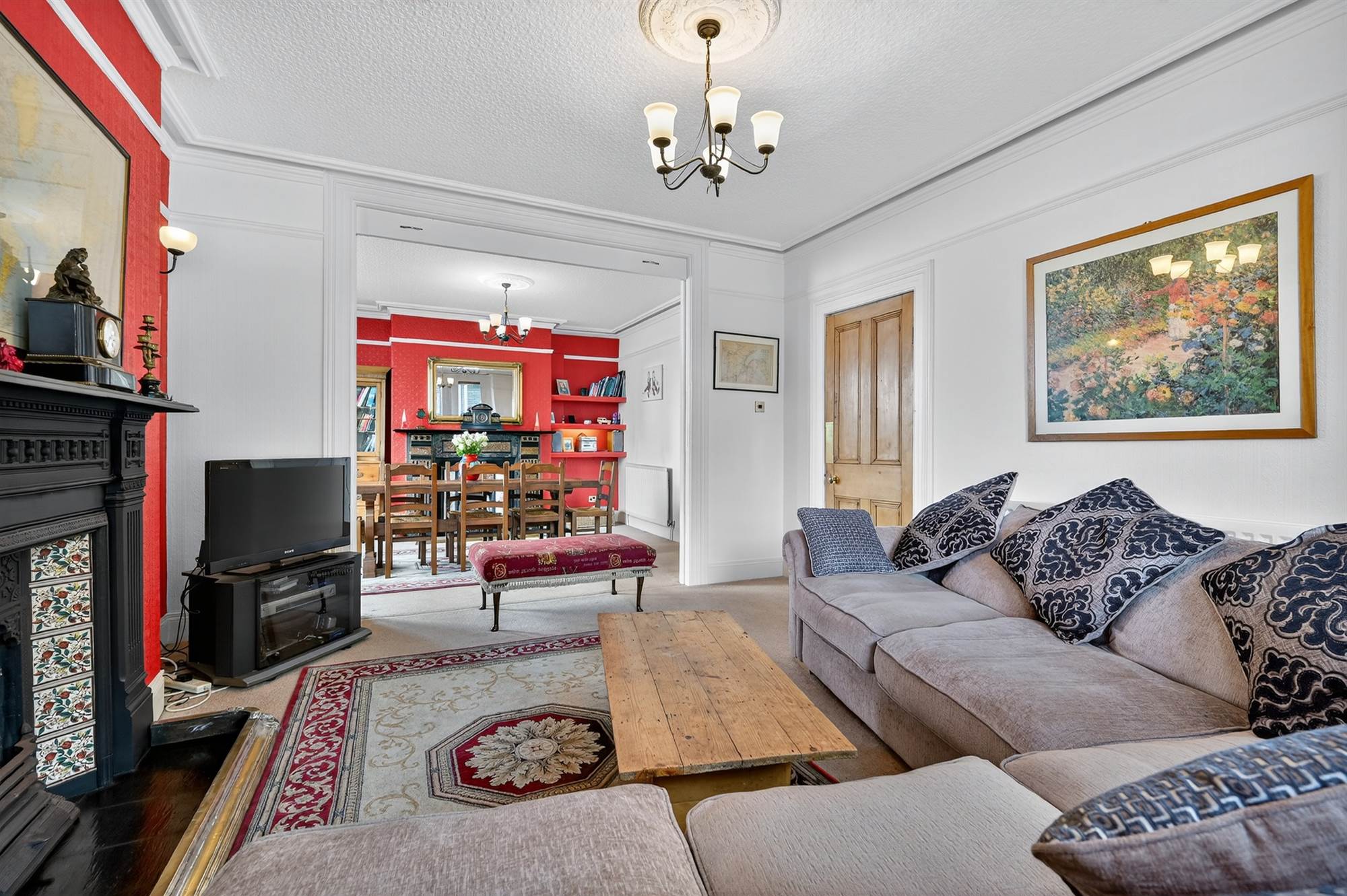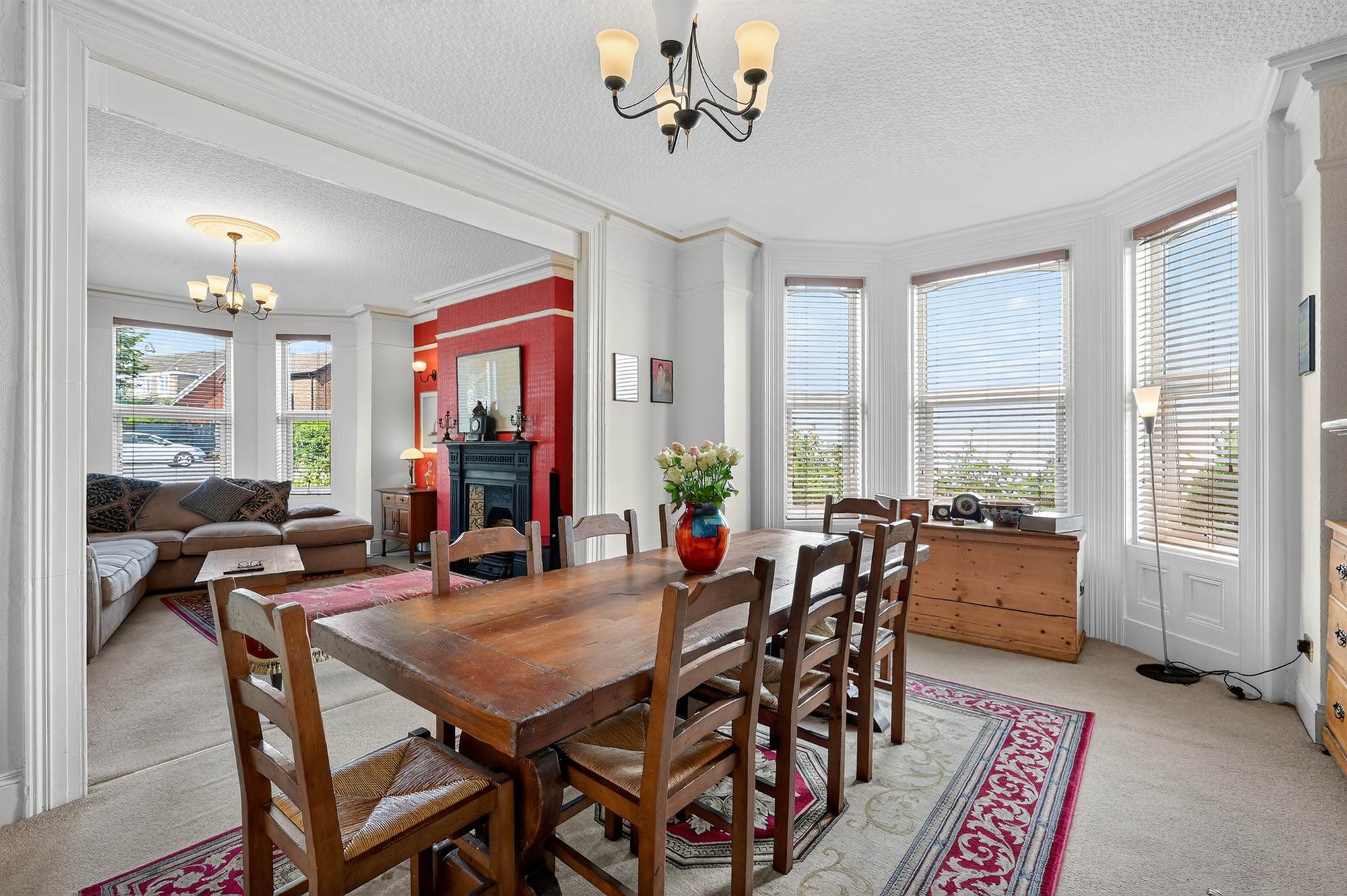 Open Plan Living Dining Room with Dual Aspect Windows and Original Fireplaces
