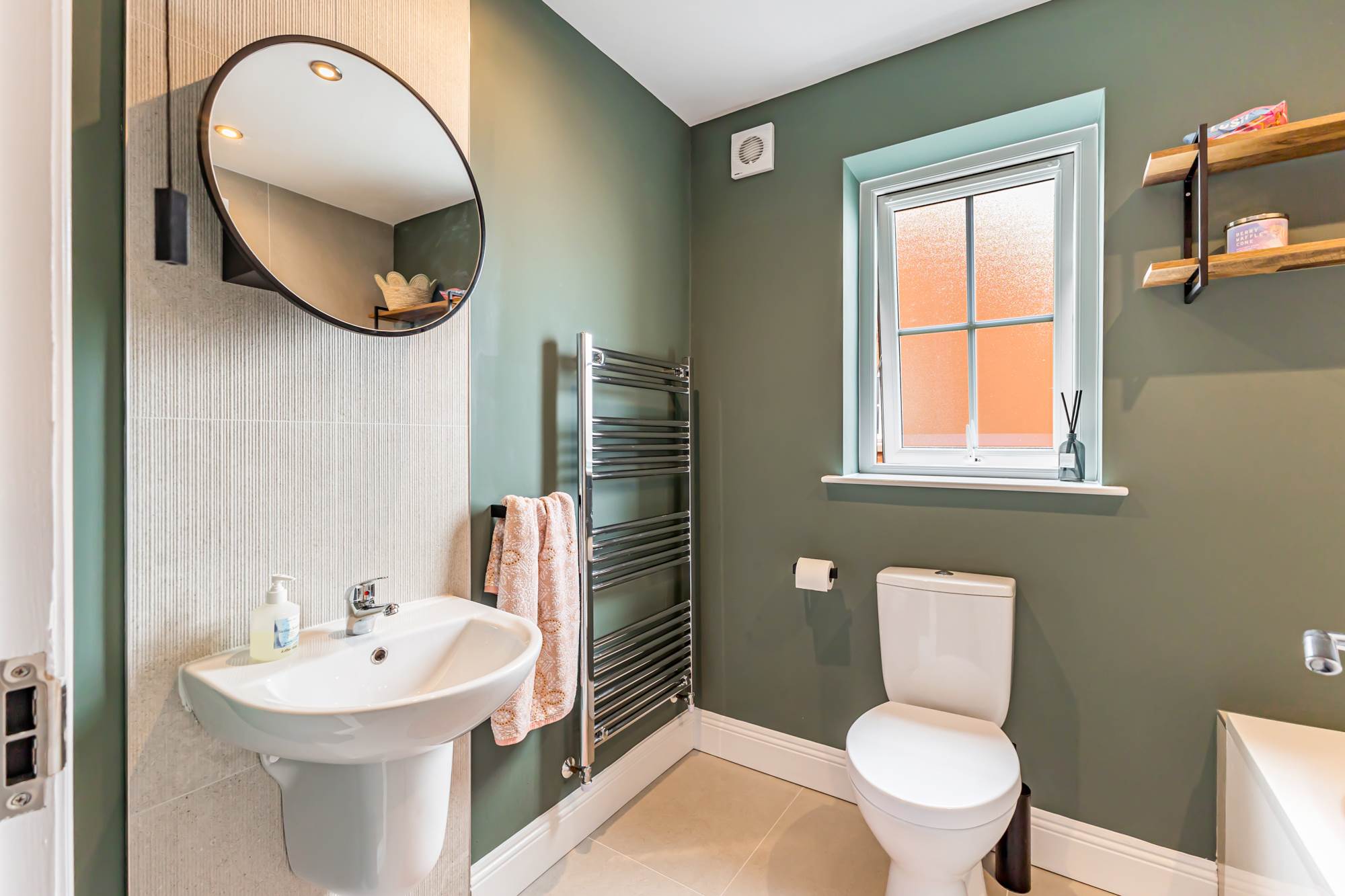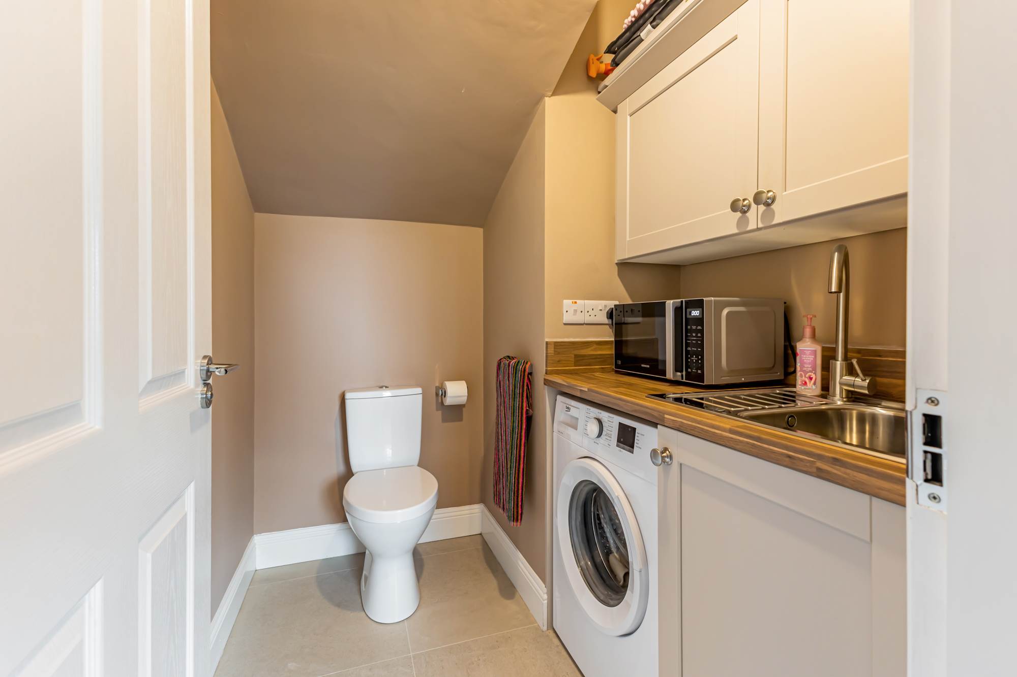 Low flush WC, wash hand basin, plumbed for washing machine.