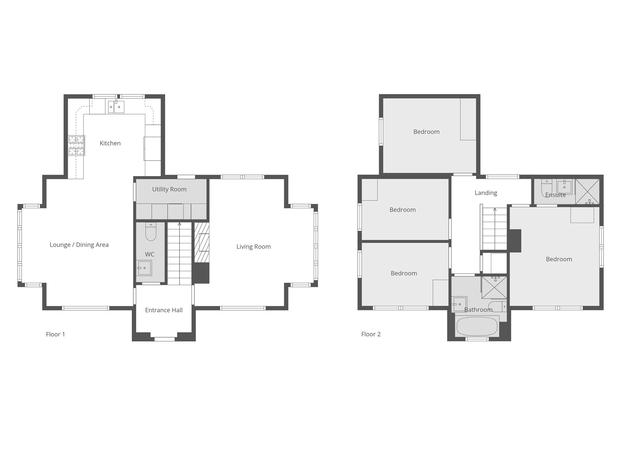 Internally, the ground floor boasts a welcoming entrance hall with access to a downstairs WC, a separate bright and spacious living room and an excellent open plan kitchen living dining space with access to a separate utility room. Upstairs, the accommodation continues to impress with a bright landing area, four generously sized bedrooms including a principal bedroom with en-suite shower room, and a stylish family bathroom complete with a modern white suite.