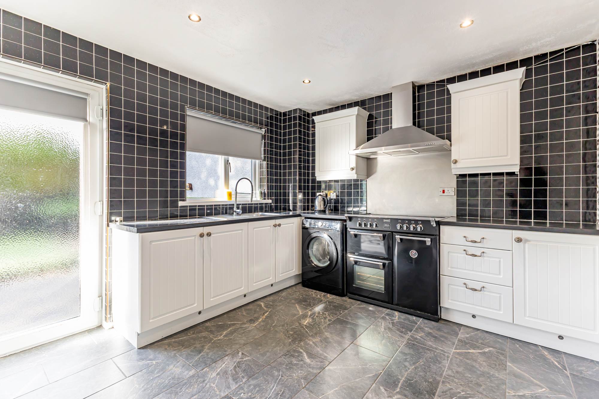Range of high and low level units, single drainer stainless steel sink unit with mixer tap, Stoves range cooker and stainless steele extractor fan, plumbed for washing machine, extractor fan, understairs storage, ceramic tiled floor.