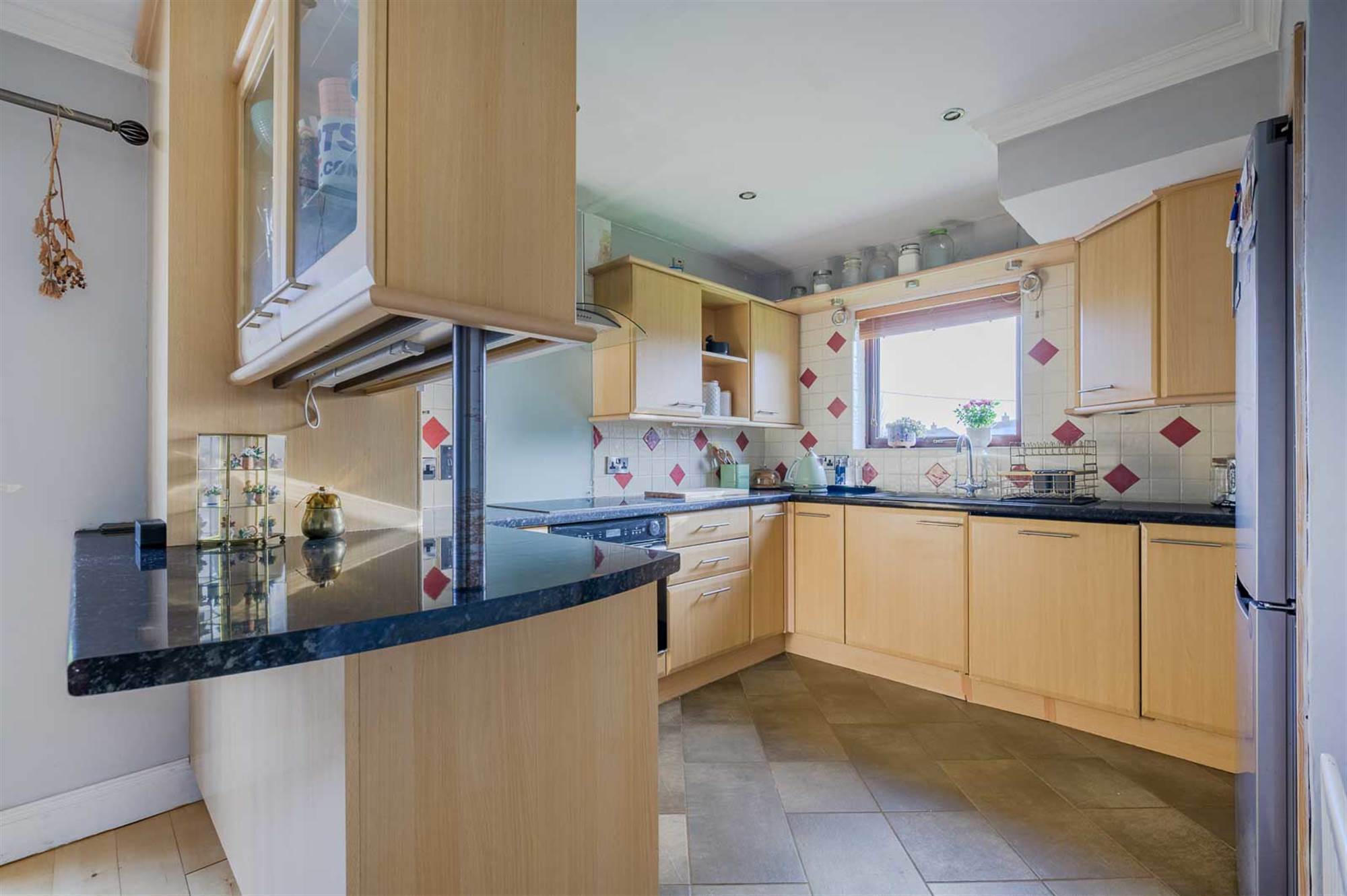 Range of high and low level units, 1.5 bowl stainless steel sink unit with mixer tap, integrated dishwasher, oven and four ring hob with extractor hood above, microwave, spotlights, ceramic tiled floor, doors to rear.