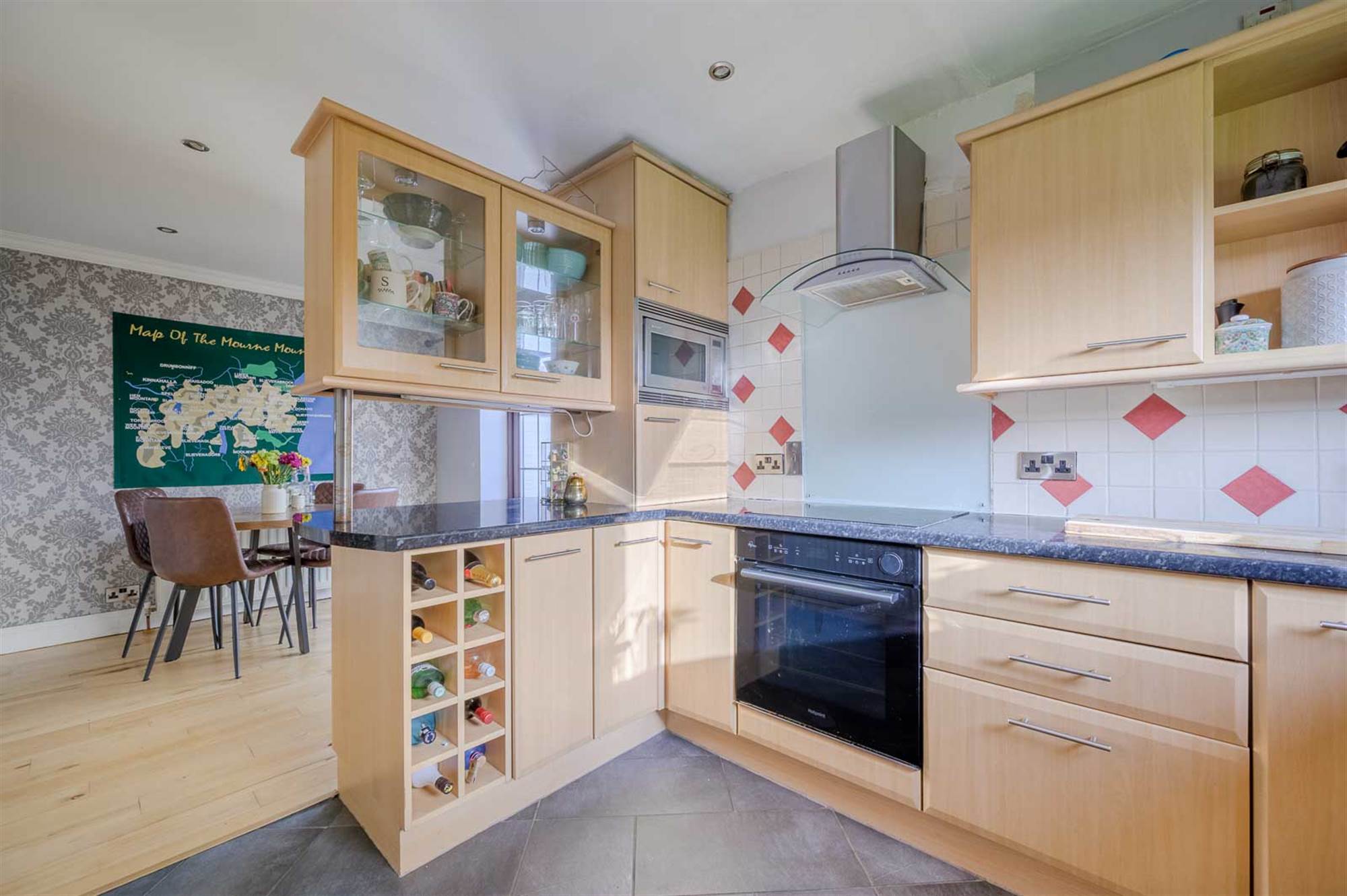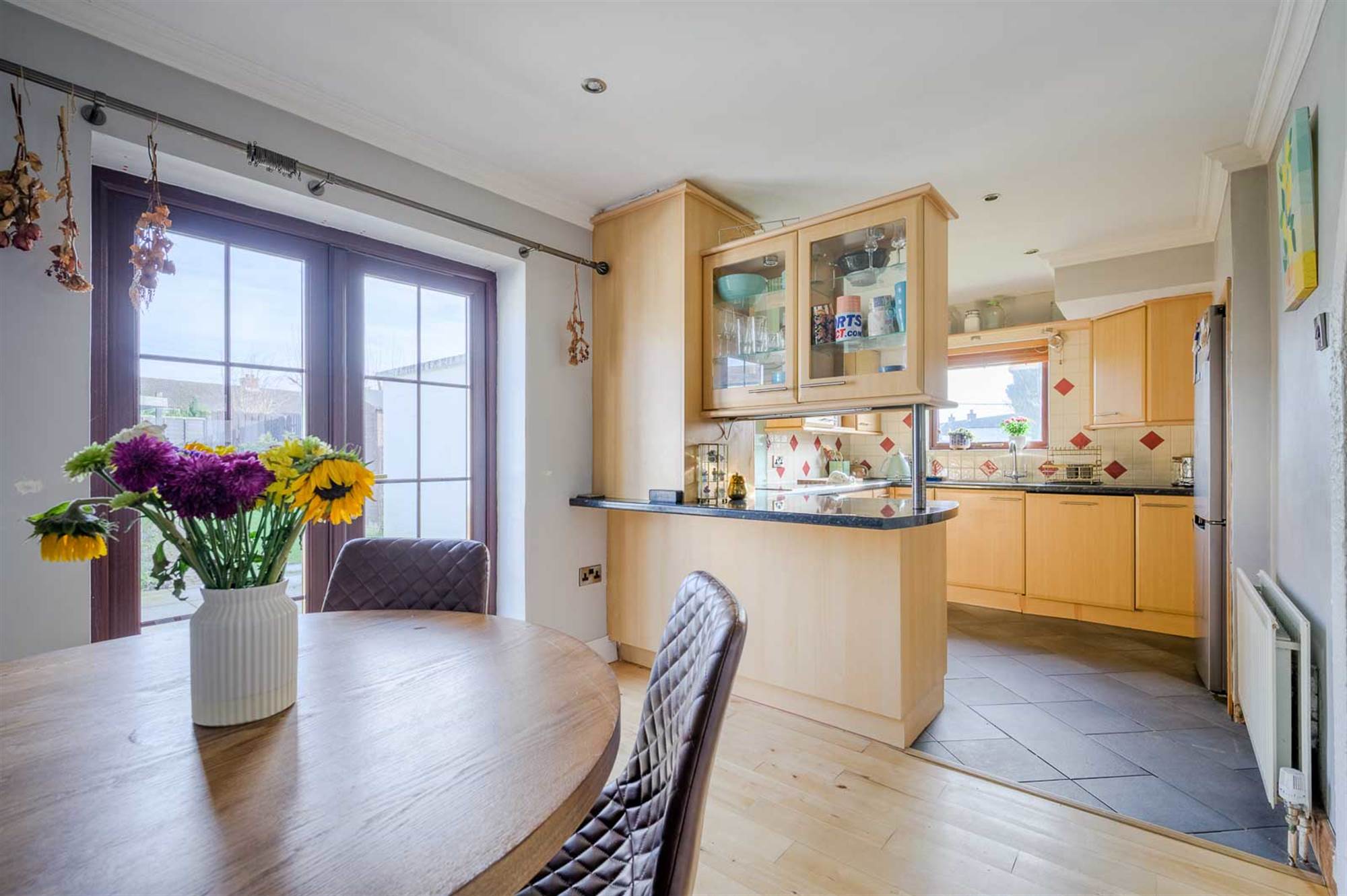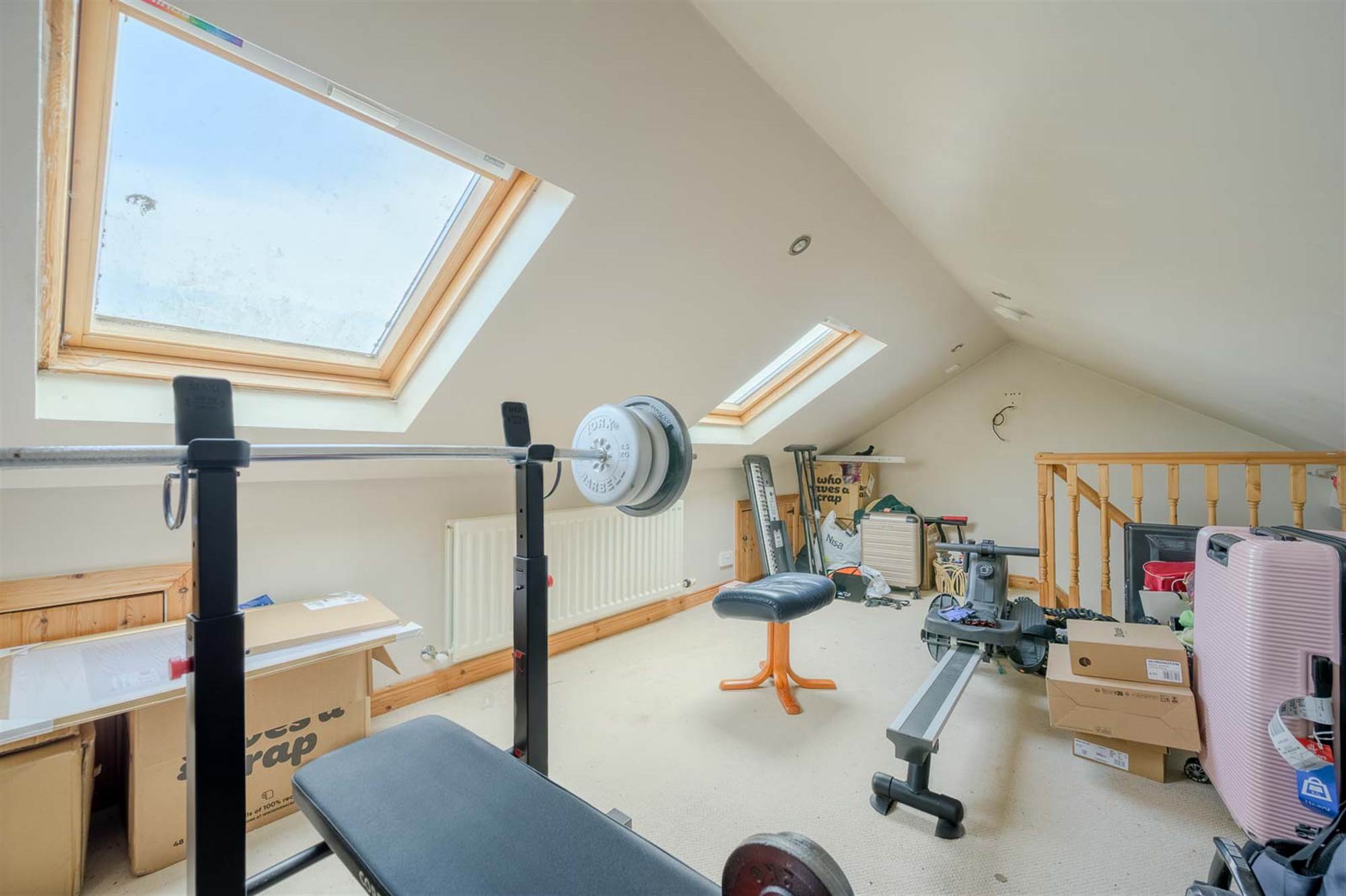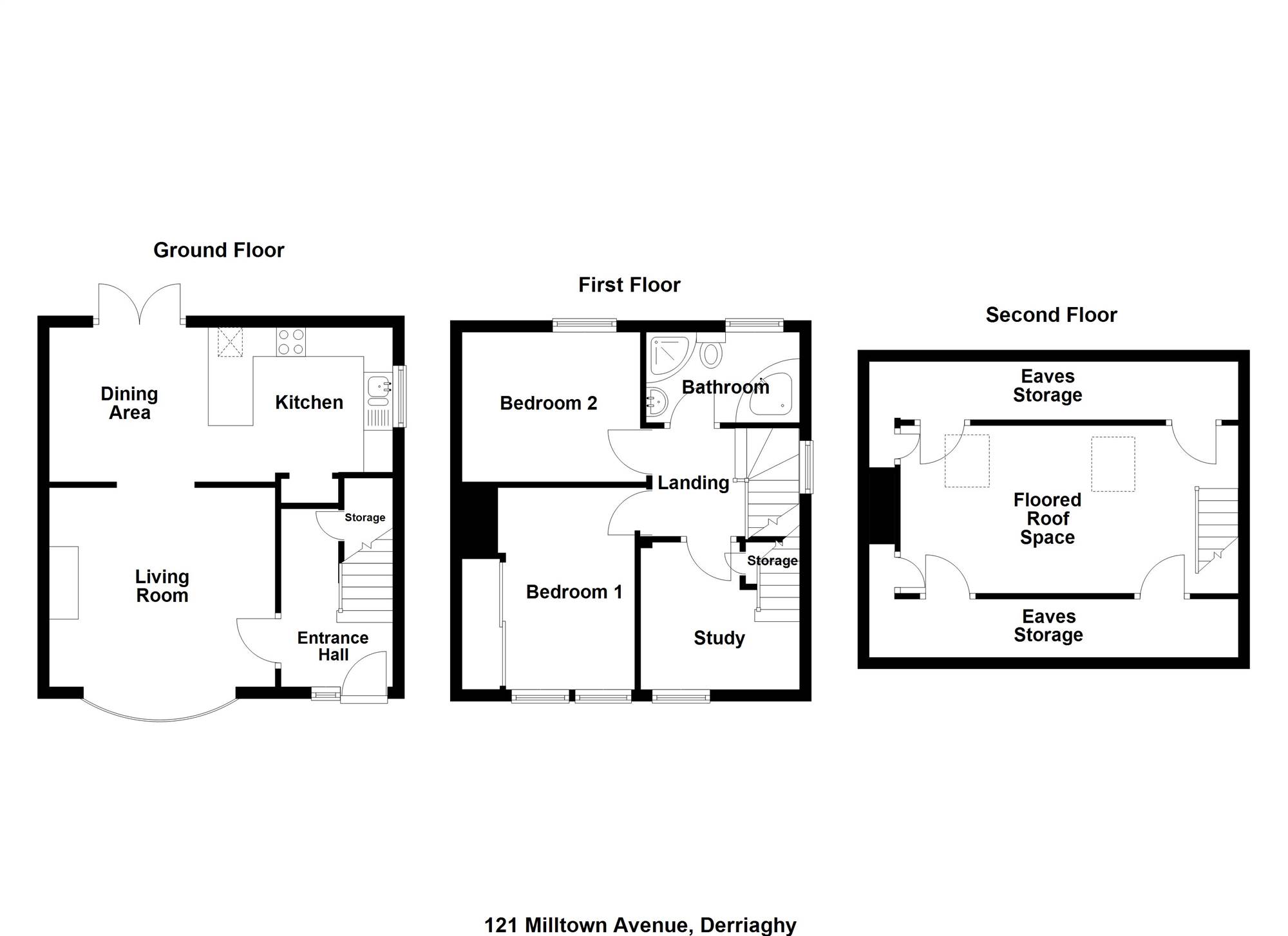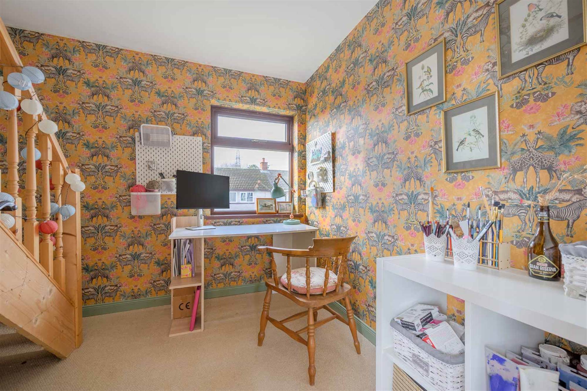 The ground floor comprises a welcoming entrance hall leading to a bright lounge, open plan to the dining area and fitted kitchen, creating a superb flow for modern living and entertaining. Upstairs, there are three bedrooms, with the third currently used as a study and benefiting from a fixed staircase to a floored roofspace, offering excellent additional storage or potential for further use (subject to approvals).