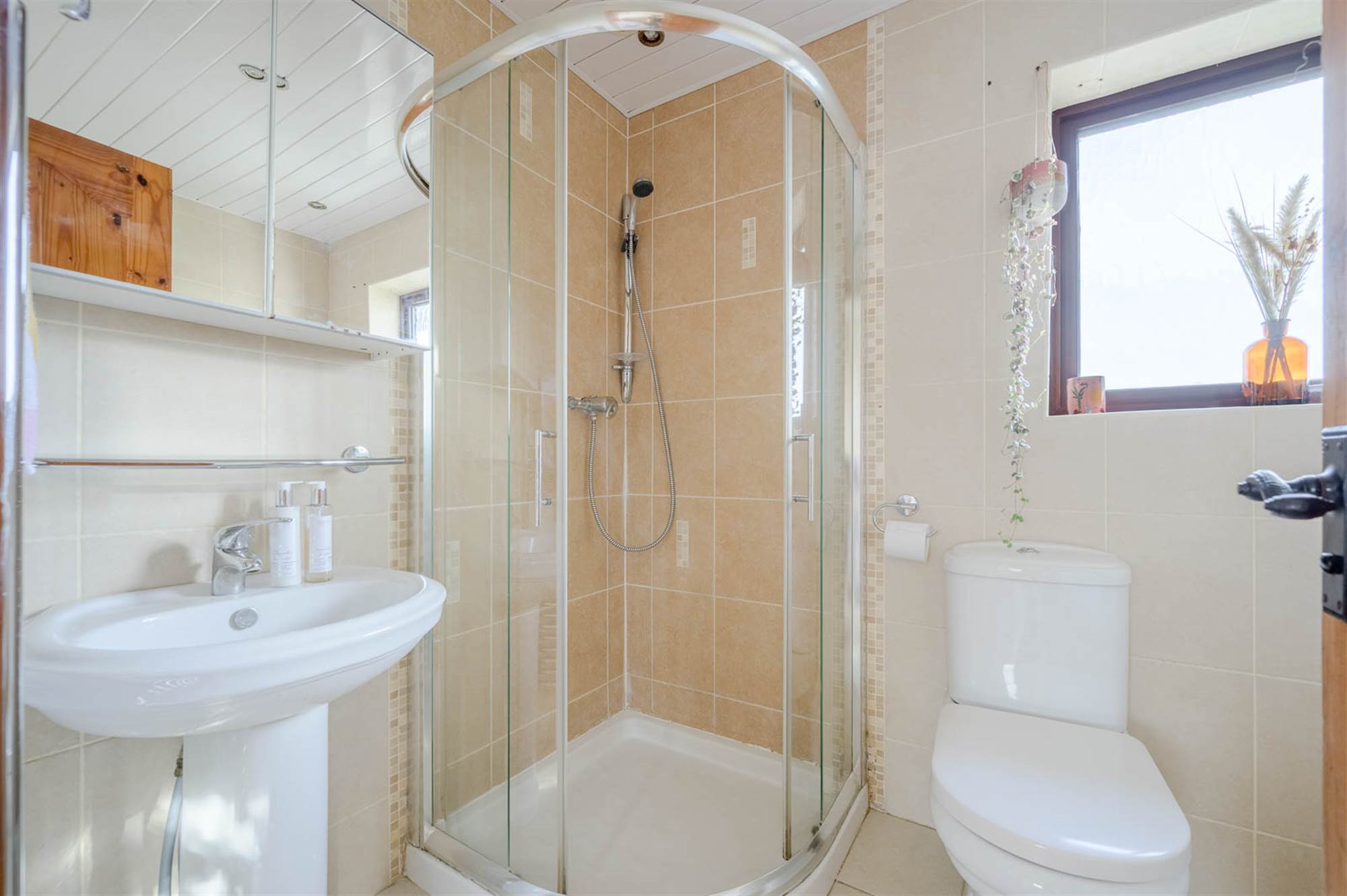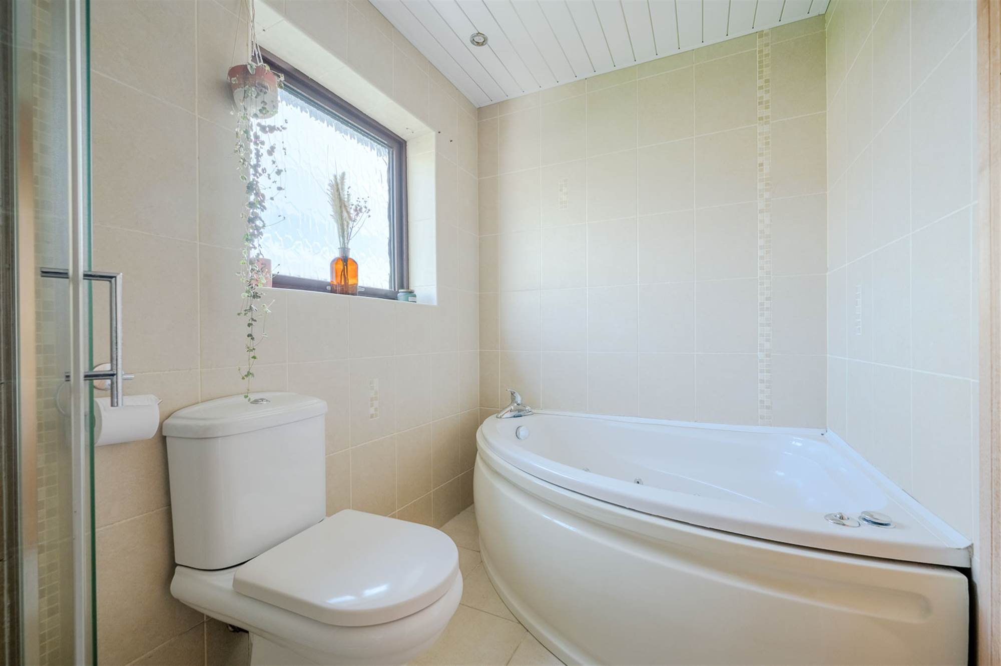 Comprising corner bath, shower with tiled inset, low flush wc, pedestal wash hand basin with mixer tap, fully tiled, extractor fan.