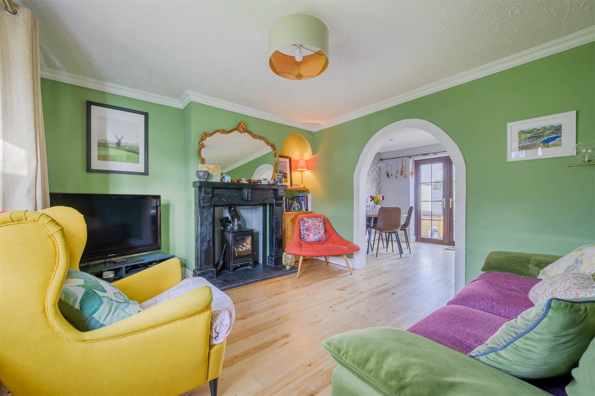Engineered flooring, bay window, feature fireplace with wooden surround, tiled inset and multi-fuel burning stove. Archway to . . .