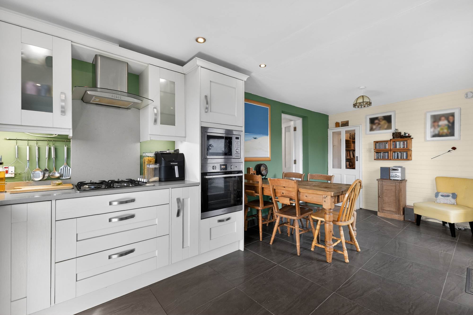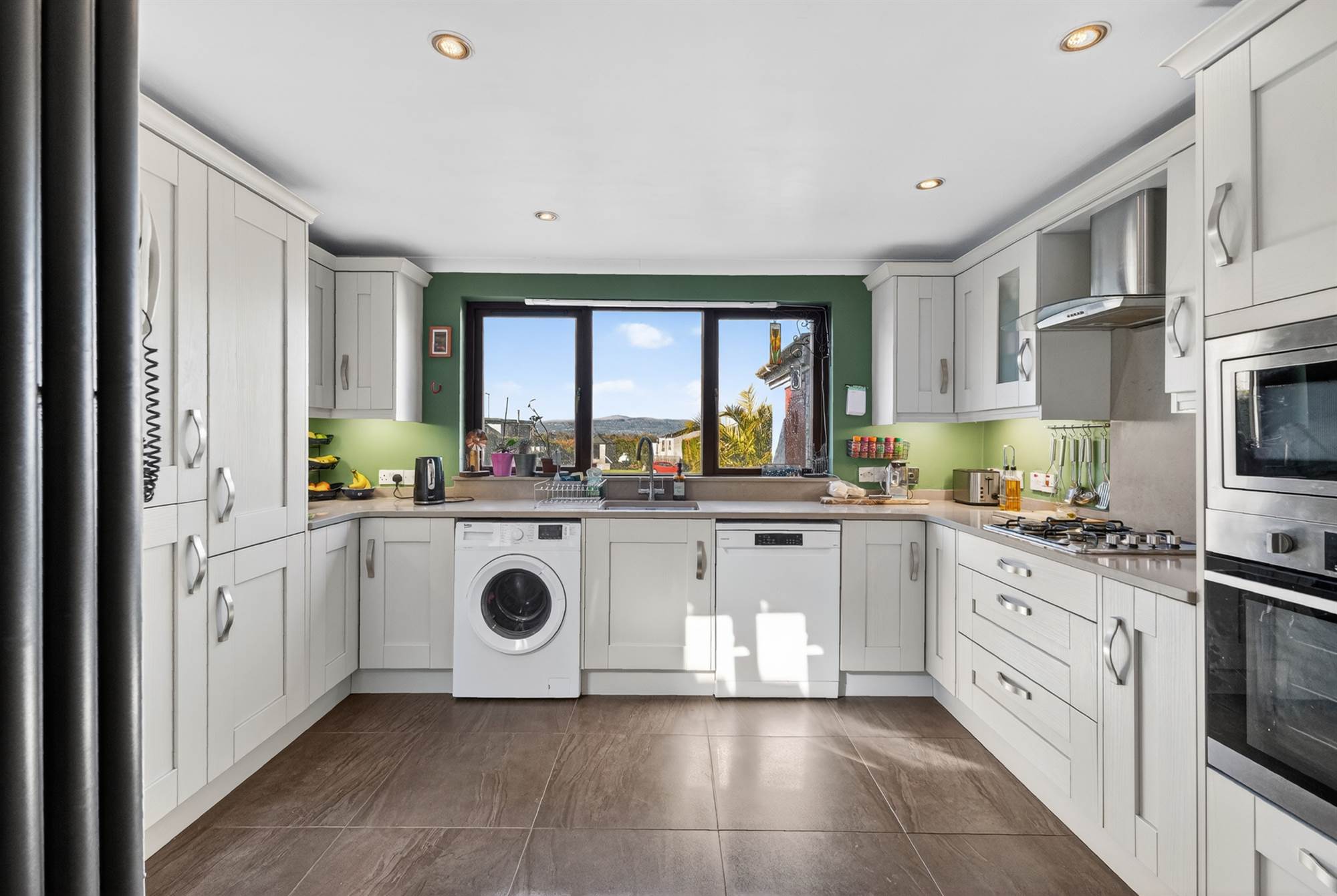 (at widest points). Bespoke fully fitted kitchen with range of high and low level units, quartz worktops and upstand. Inset stainless steel sink unit with side drainer and mixer tap, built-in fridge/freezer and built-in larder storage. Plumbed for washing machine, plumbed for dishwasher. Four ring stainless steel gas hob with splashback and extractor fan above. Integrated high level microwave and integrated oven and grill. Polished tiled floor, floor to ceiling radiator. Triple aspect with panoramic views over mountain range. Mahogany double glazed French doors to garden.
