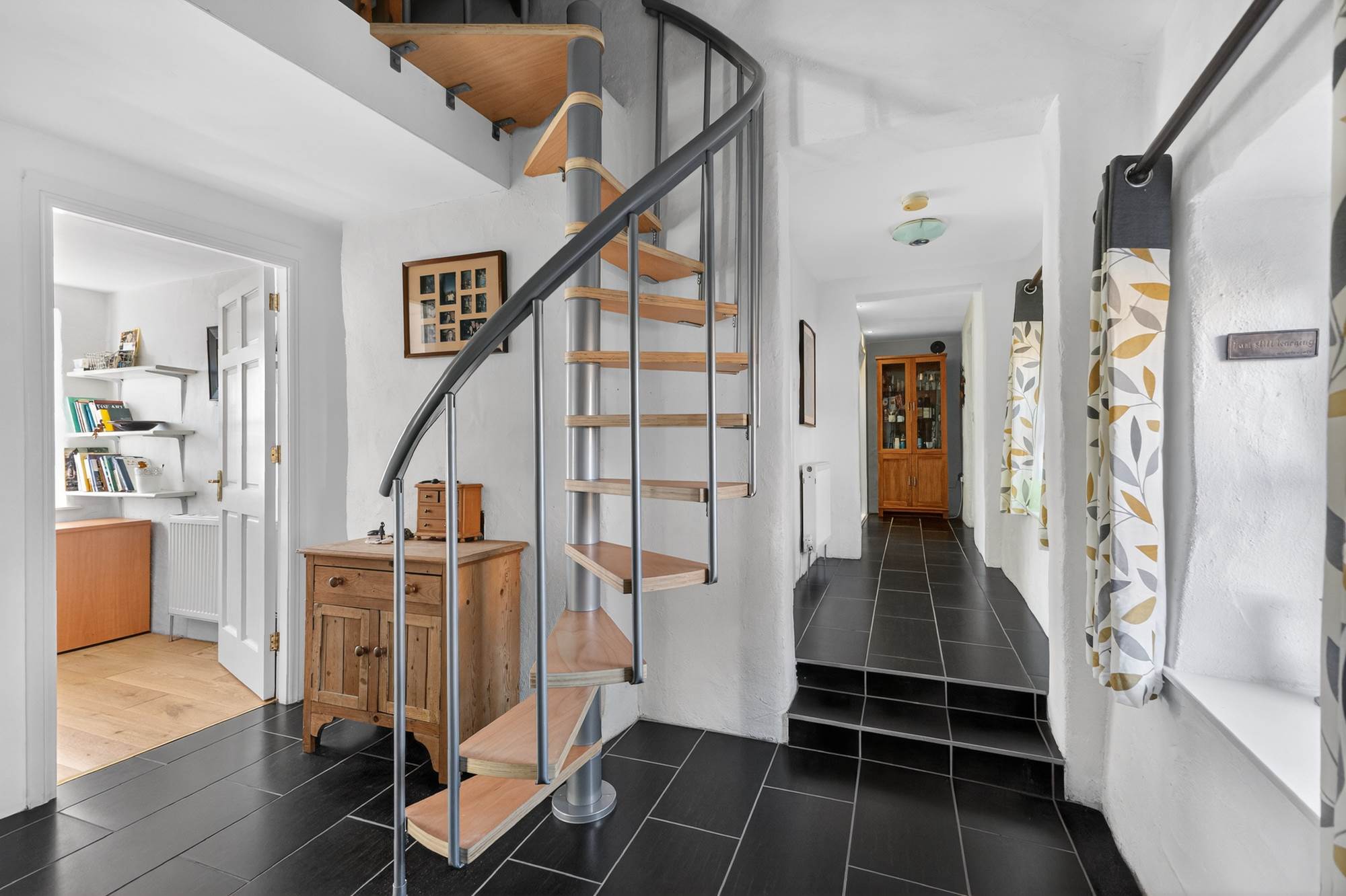 Tiled floor, outlook to rear. Spiral staircase to: