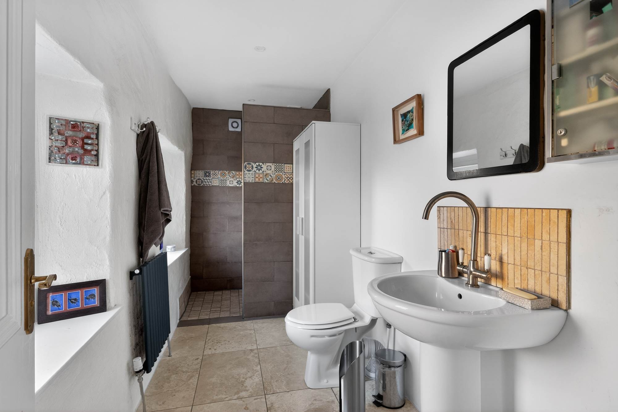 A striking spiral staircase leads to a floored attic area, providing excellent additional space with flexibility for a range of uses, subject to any necessary consents.