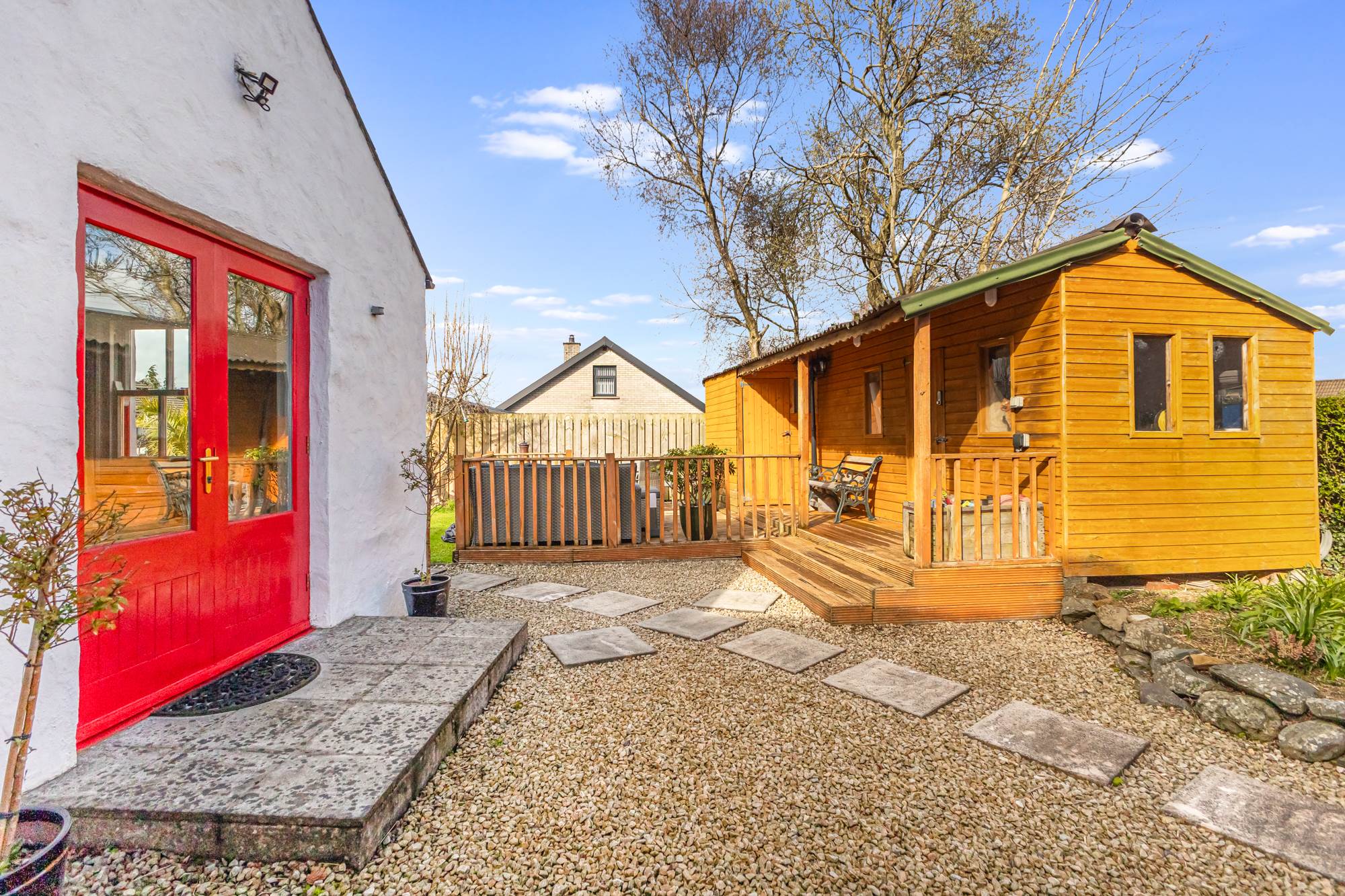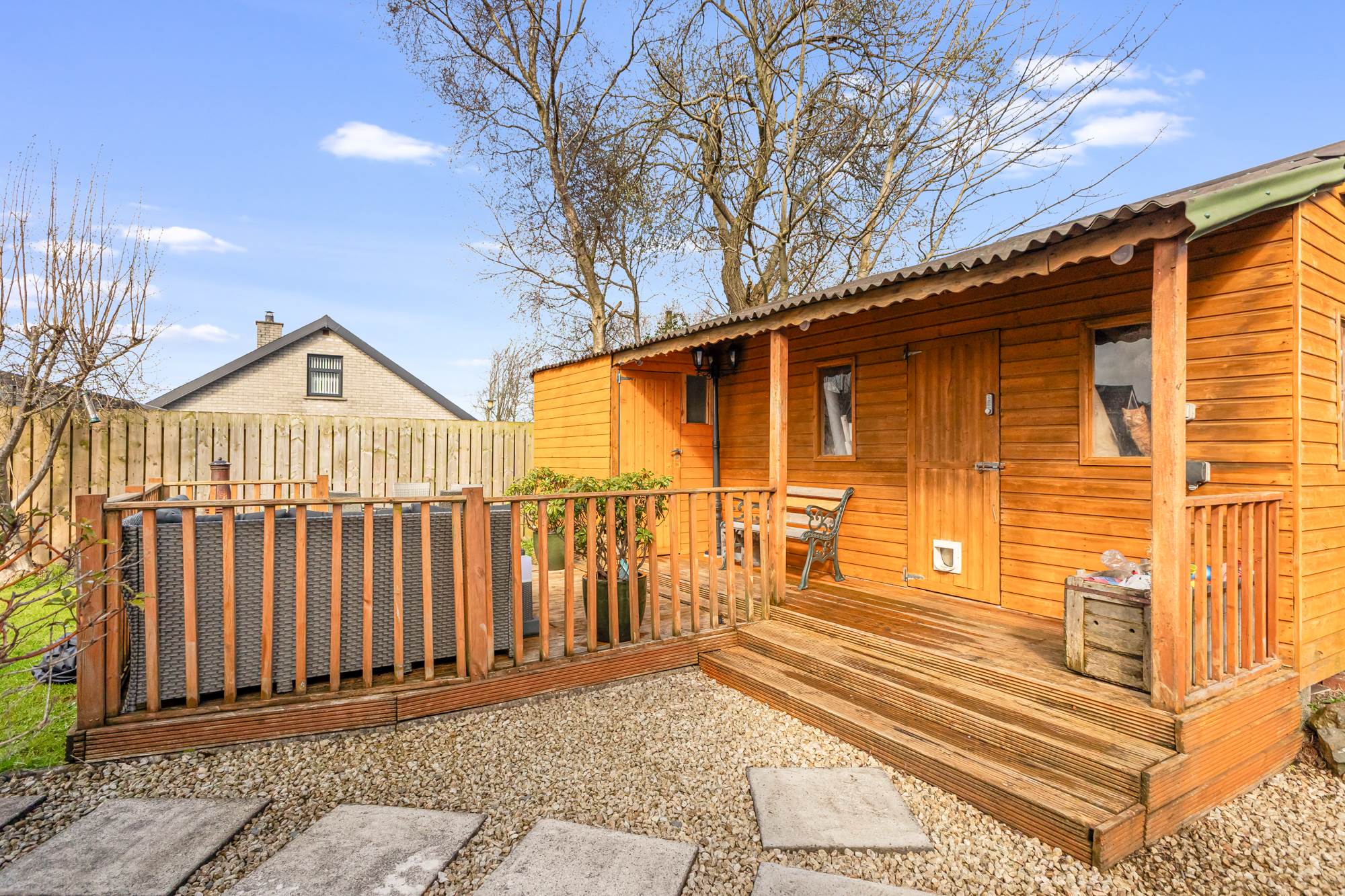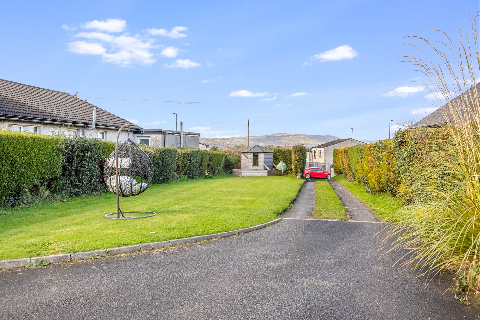 Extensive surrounding gardens, part in patio, part laid in lawns with mature flowerbeds and hedging. Private laneway/driveway leading to tarmac parking area with off-street parking for 3-4 cars. Fantastic views across Belfast mountain range. Access to gas tank and gas boiler. Wood storage. Paved walkway to detached timber shed with extensive decking area and workshop/bar.