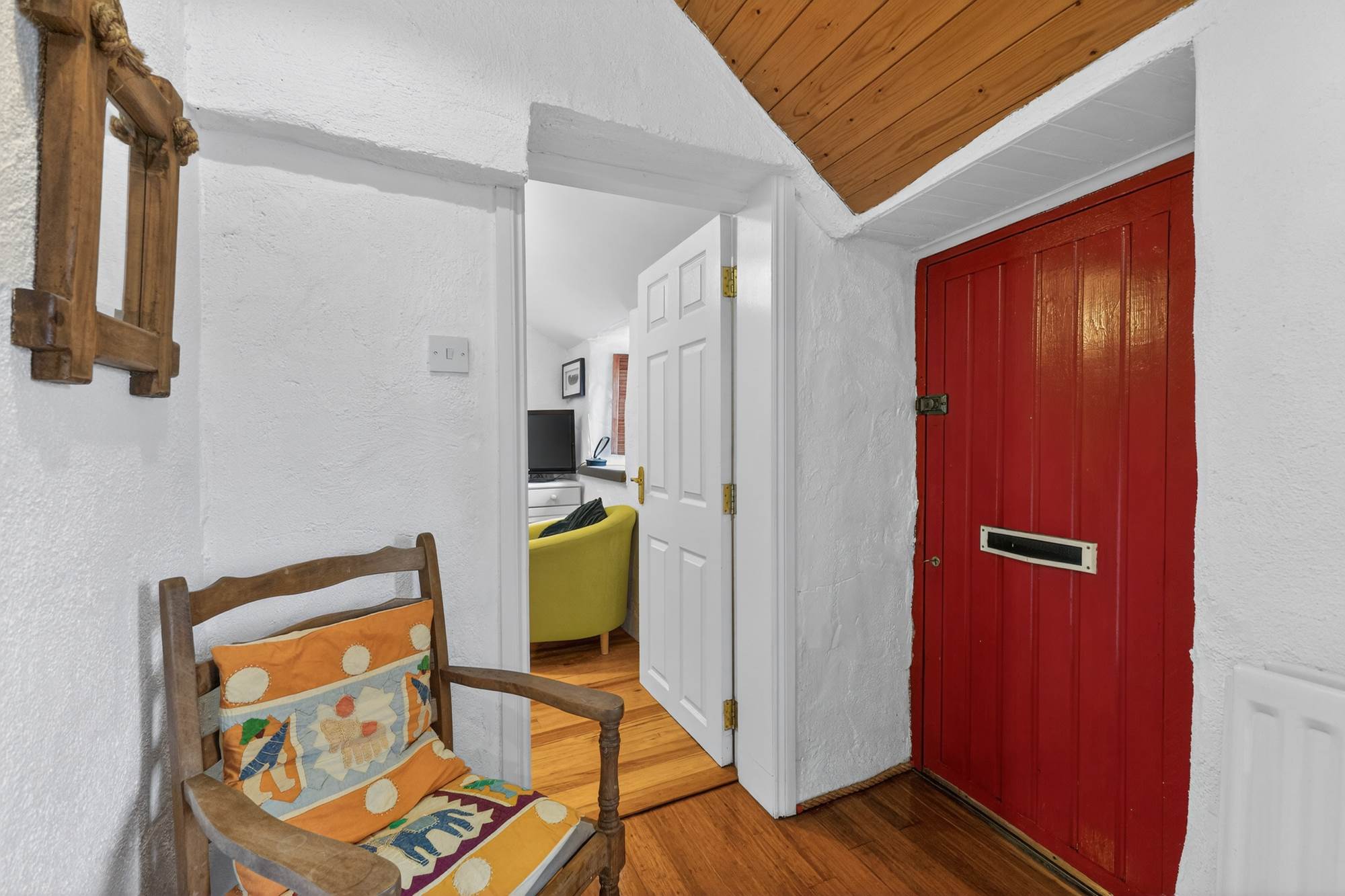 Hardwood front door with letterbox into: